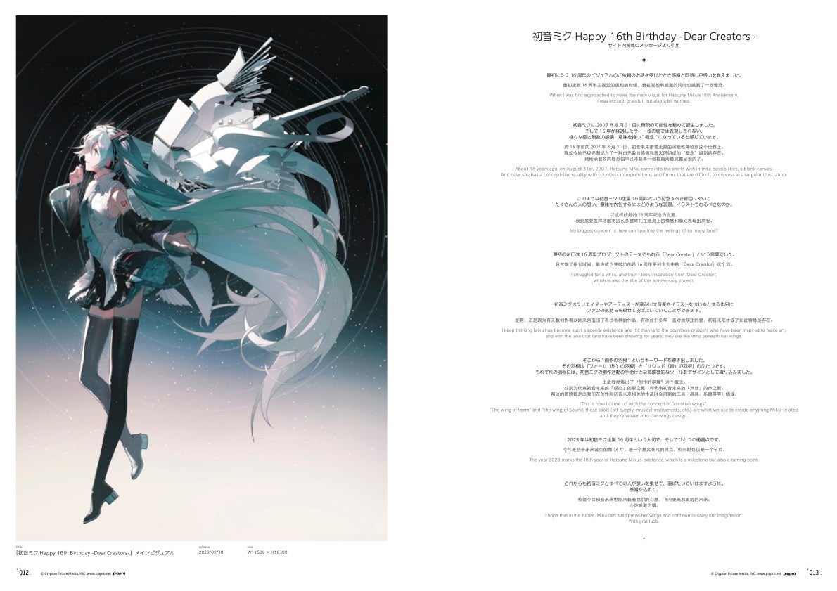 クリプトン・フューチャー・メディア株式会社が開発した、歌詞とメロディーを入力して誰でも歌を歌わせることができる「歌声合成ソフトウェア」。2007年8月31日に誕生して以来、多くのクリエイターの手により、音楽・イラスト・動画・CGなど様々なジャンルの作品として創作されてきた。パッケージに描かれているキャラクターとしての『初音ミク』は、ブルーグリーンのツインテールが特徴的な、16歳の女性バーチャル・シンガー。設定年齢と並ぶ特別な「16歳の誕生日」を迎えた2023年には、これまでの軌跡を振り返りながら、創作文化の未来を育むプロジェクト「初音ミク Happy 16th Birthday -Dear Creators-」を実施した。