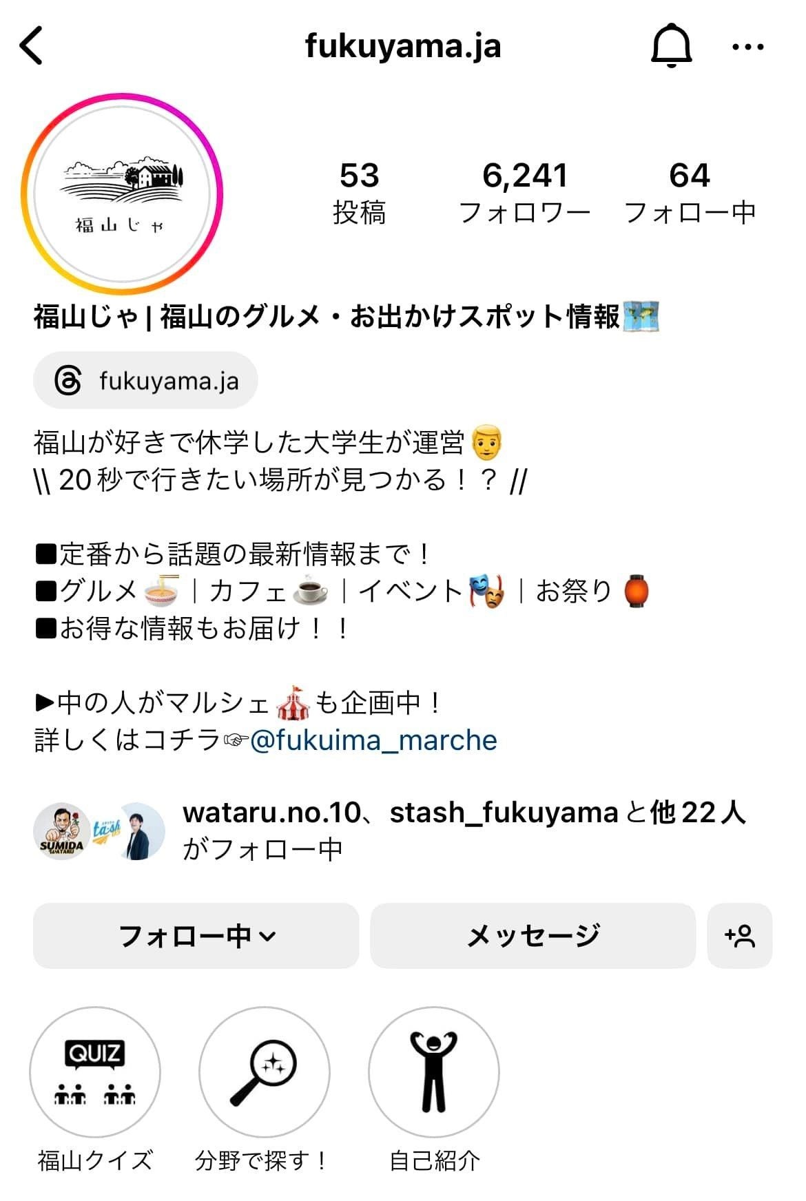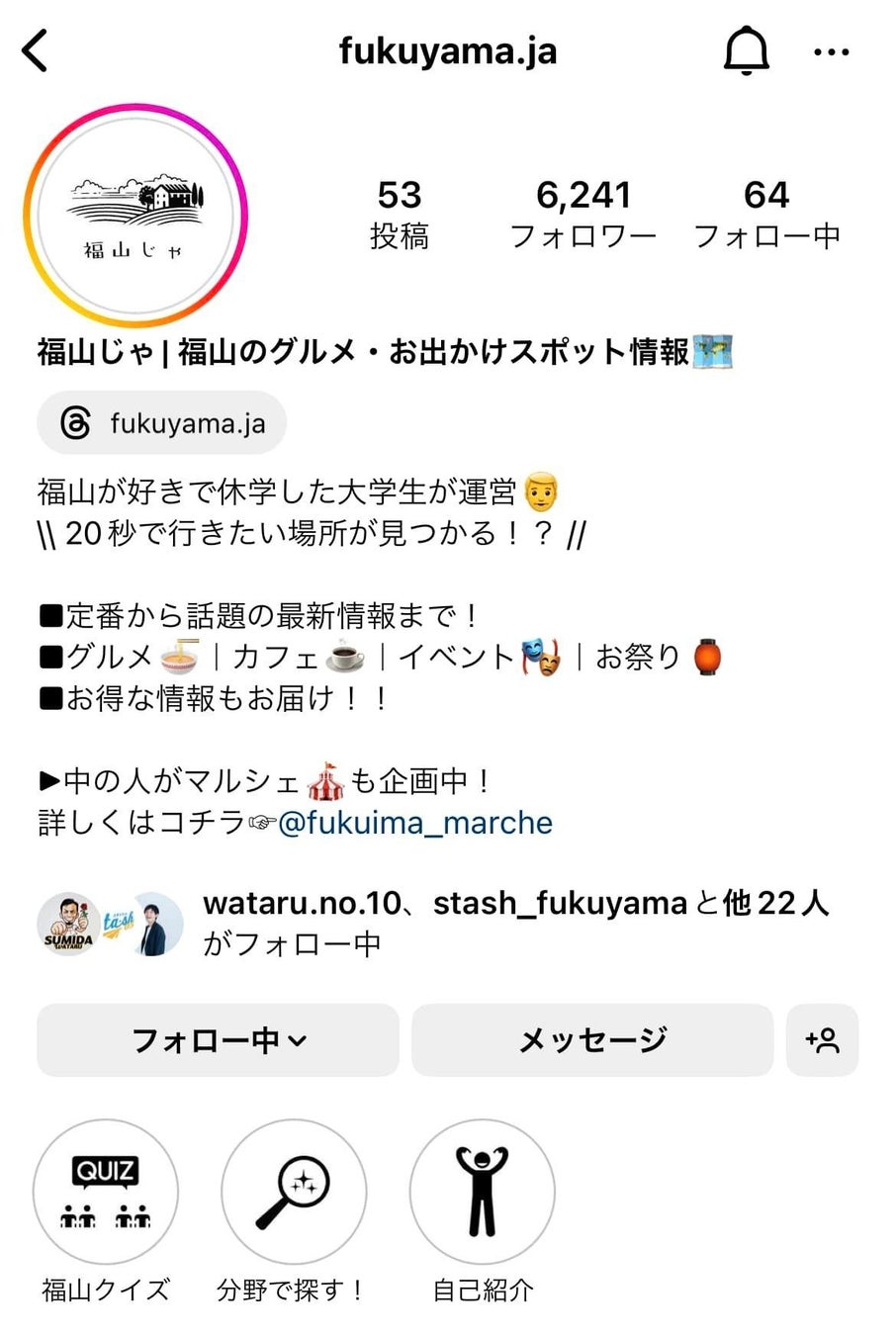 ・Instagram「福山じゃ」SNS総フォロワー数 6000人超(5ヶ月で達成)