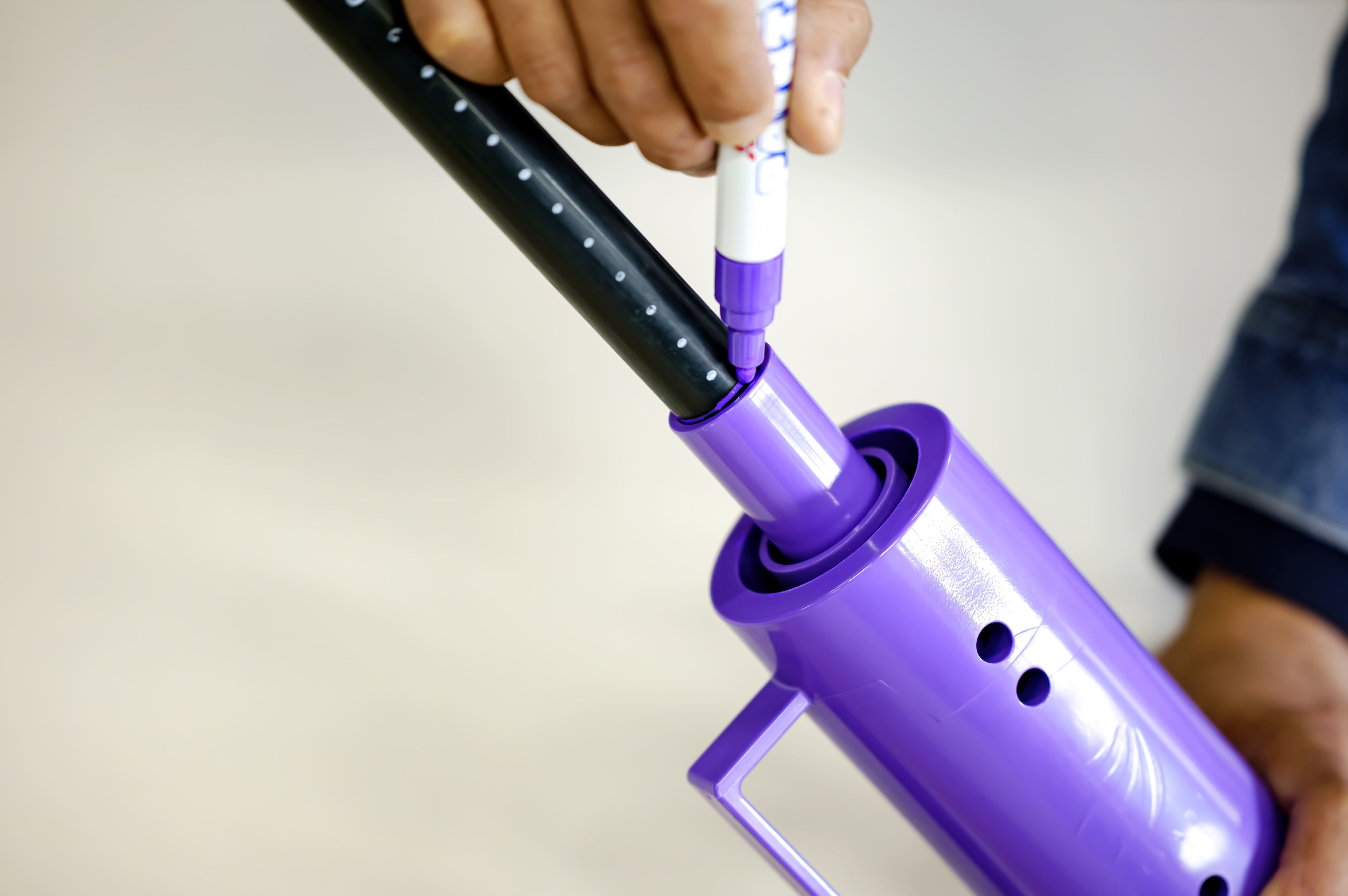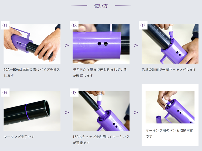 一周かんたん君は、誰でも・簡単・迅速に、塩ビ配管のマーキング作業ができる治具です。適合する溝にパイプを差し込んでマーキングするだけの簡単構造で、 1カ所7秒の早業で正確に美しい線を引くことができます。 さらに、1周(全周)マーキングを可能にしたため視認性が高いのが特徴です。