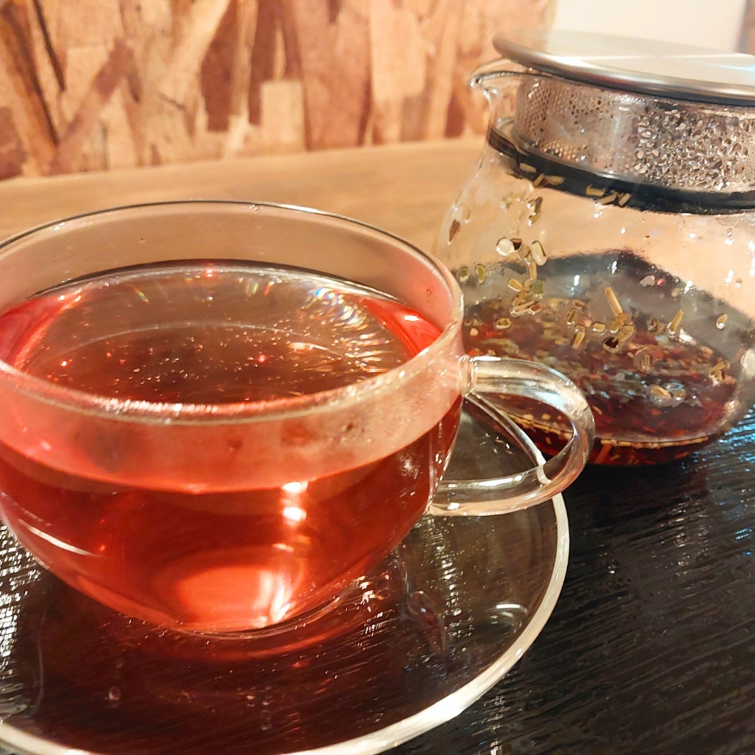 美容や健康、アンチエイジングに良いとされるレッドグレープリーフ(赤ブドウ葉)をベースにしたカシス&ローズティーや、リラックスやストレス解消に良いとされるカモミール&リンデンティーなど、常時4種類のミックスハーブティー(660円税込)をご提供しています。