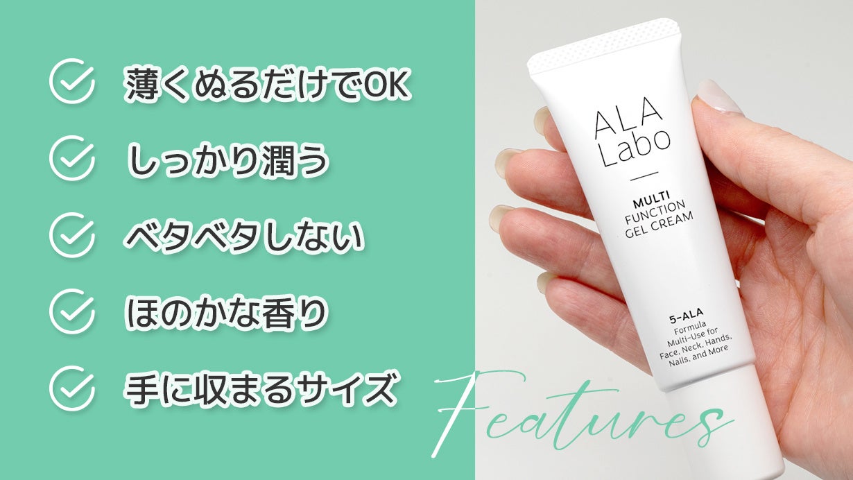 ALALabo(アララボ)マルチファンクションジェルクリームは「これだけでしっかりうるおう」ことを考えて作られたクリームです。いつでもどこでも顔も手もこれ一本で、潤いを補えます。