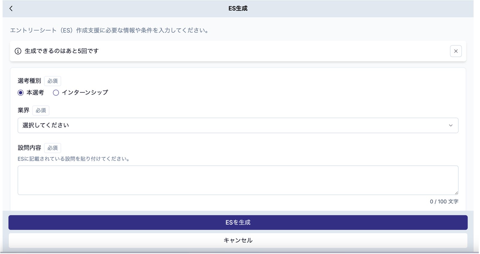※初回プロフィール登録時、「ES生成」「ガクチカ生成」合わせて5回まで無料で利用可能。その後1日3回まで無料で利用可能。