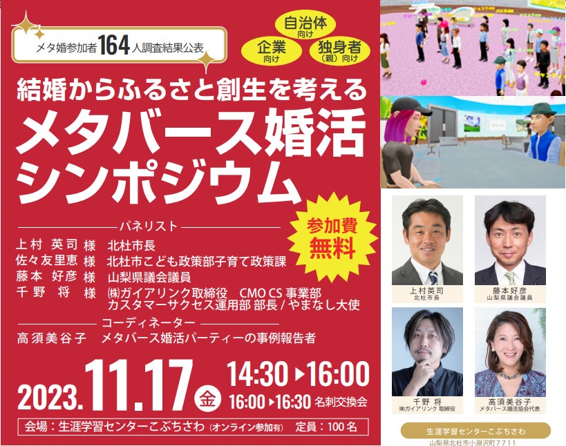 今回は、従来の概念を超え、姿や条件が見えない全く新しい婚活スタイル「メタバース婚活」を2022年にいち早く市民向けに導入した山梨県北杜市の事例をはじめ、約1年間で開催した10自治体、164名の参加者の声の集計結果を公表します。メタバースならでは、仲人の経験ならではの気づきを共有できるでしょう。