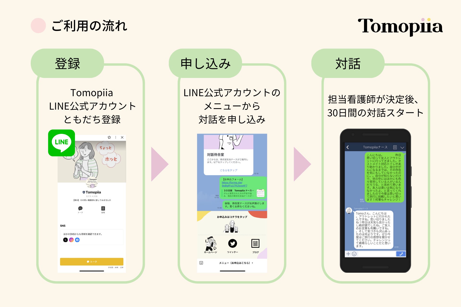 まず、下記のQRコードもしくはURLより、Tomopiia公式LINEアカウントのともだち登録をしていただき、公式アカウント内の専用フォームからお申し込みいただきます。公式アカウントは事務局が担当看護師を決定するまでの待合室になっており、看護師や事務局からのメッセージを配信しております。担当が決定しましたら双方の対話がスタートいたします。一定期間(30日間)の対話体験をお楽しみください。