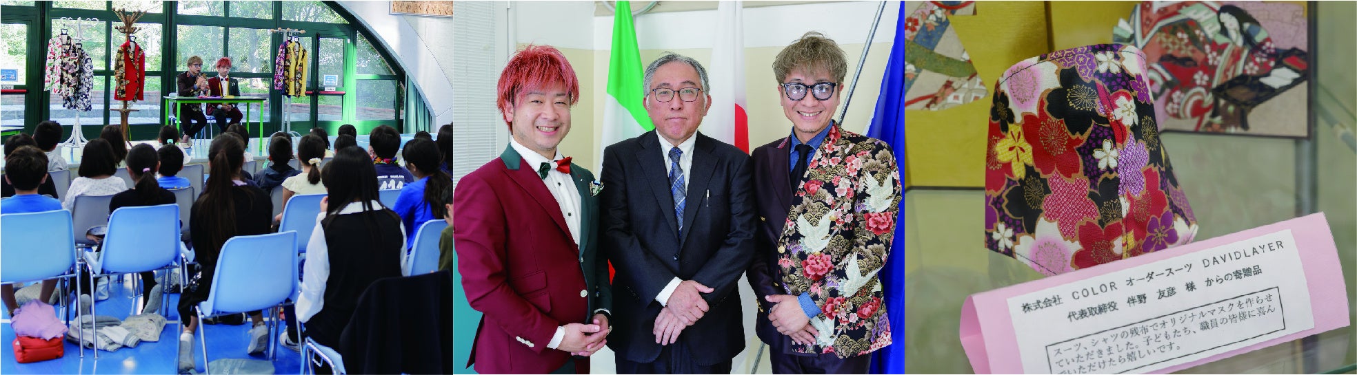現地のミラノ日本人学校より招待を受けミラノ日本人学校の小学生、中学生とその保護者も含めた約150 名にこれまでの活動やミラノコレクションについての講和をさせて頂き、今回のミラノコレクション用のオーダースーツを子供達に着用してもらうなど、今回のミラノコレクション参加をきっかけに交流を深めることもできました。