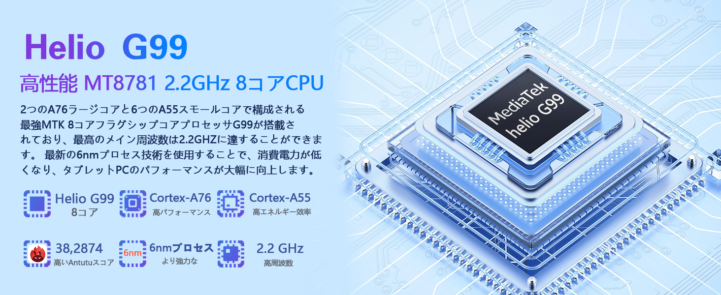 MediaTek Helio G99、6 nm で製造されたオクタコア。 2.2 GHz に達する 2 つの ARM Cortex-A76 プロセッサ + 最大 2.0 GHz に達する 6 つの ARM Cortex-A55 を搭載したチップ。消費電力が低くなり、タブレットPCのパフォーマンスが大幅に向上します。 ANTUTUスコアは370,000 以上と高く。