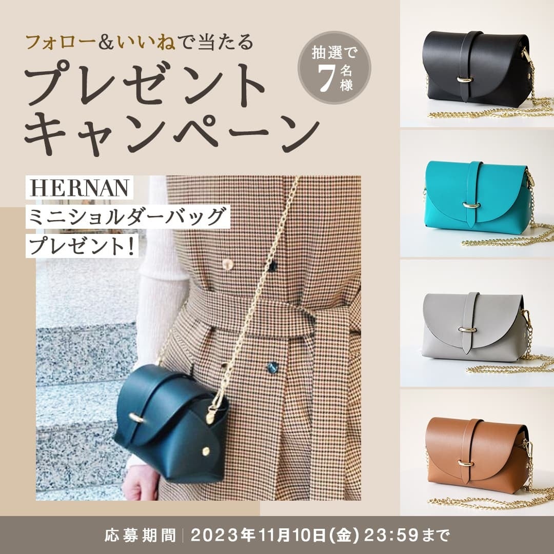 今回のプレゼントはフィレンツェの老舗バックメーカーHERNAN(ヘルナン) のミニショルダーバッグです。イタリア製の上質な牛革を使用しており、コーデのポイントになること間違いありません。スマートフォンがぴったり入るコロンとしたサイズ感で、どんなコーディネートにも合わせやすくオールシーズン大活躍します。たくさんのご応募お待ちしております。