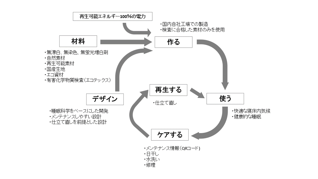 また、滋賀工場では太陽光や小水力発電による、再生可能エネルギー100%の電力を採用し、寝具業界で初めて「再エネ100宣言 RE Action」に参加しております。