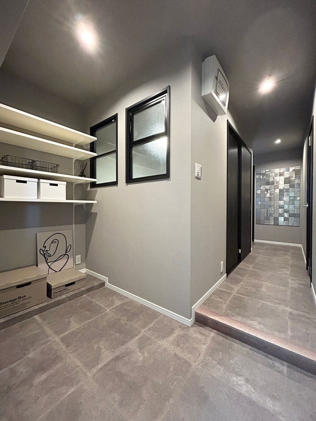 玄関、土間には、モルタル調かつヴィンテージ感のあるグレーの床。そして土間と室内廊下をあえて同じ床材で一続きにして、空間の広がりを見せるようにしています(A)。壁もデザイン性を重視して一般的な白ではなく、グレーのクロスを貼っています。壁面の装飾には、「ミラノアバンギャルド」という名前のステンレスタイルを使用。レザーの素材感を金属のプレス加工で実現したタイルは9種類。9つのパターンの組み合わせが大人ロックな空間デザインを加速します(B)。