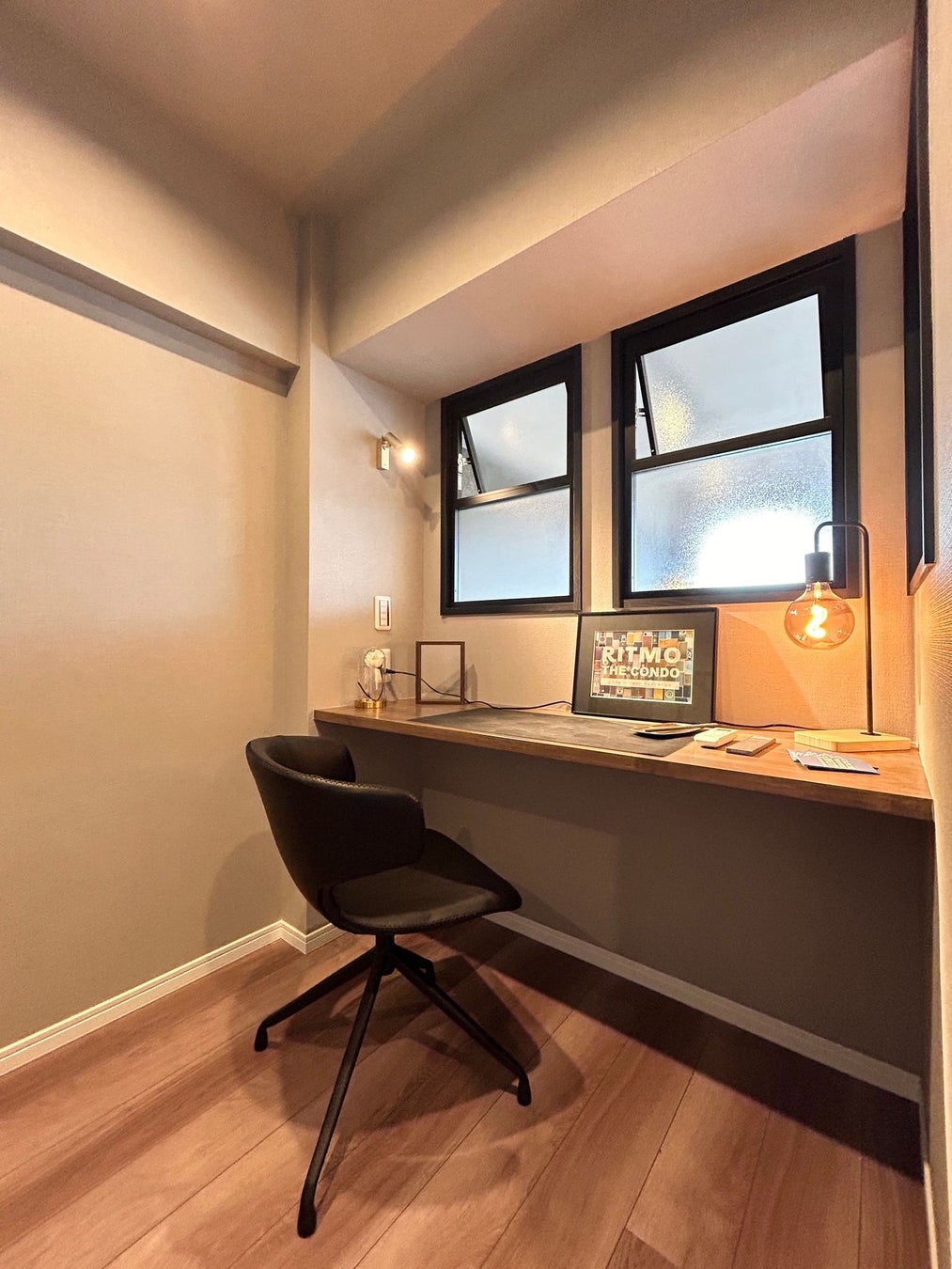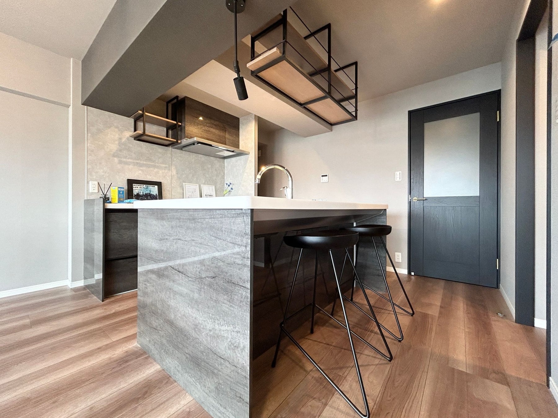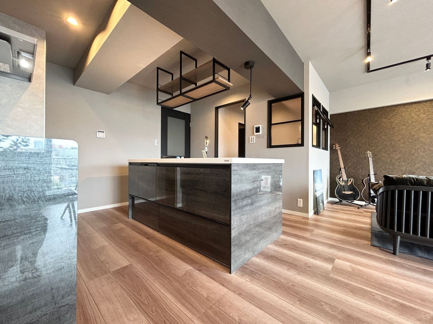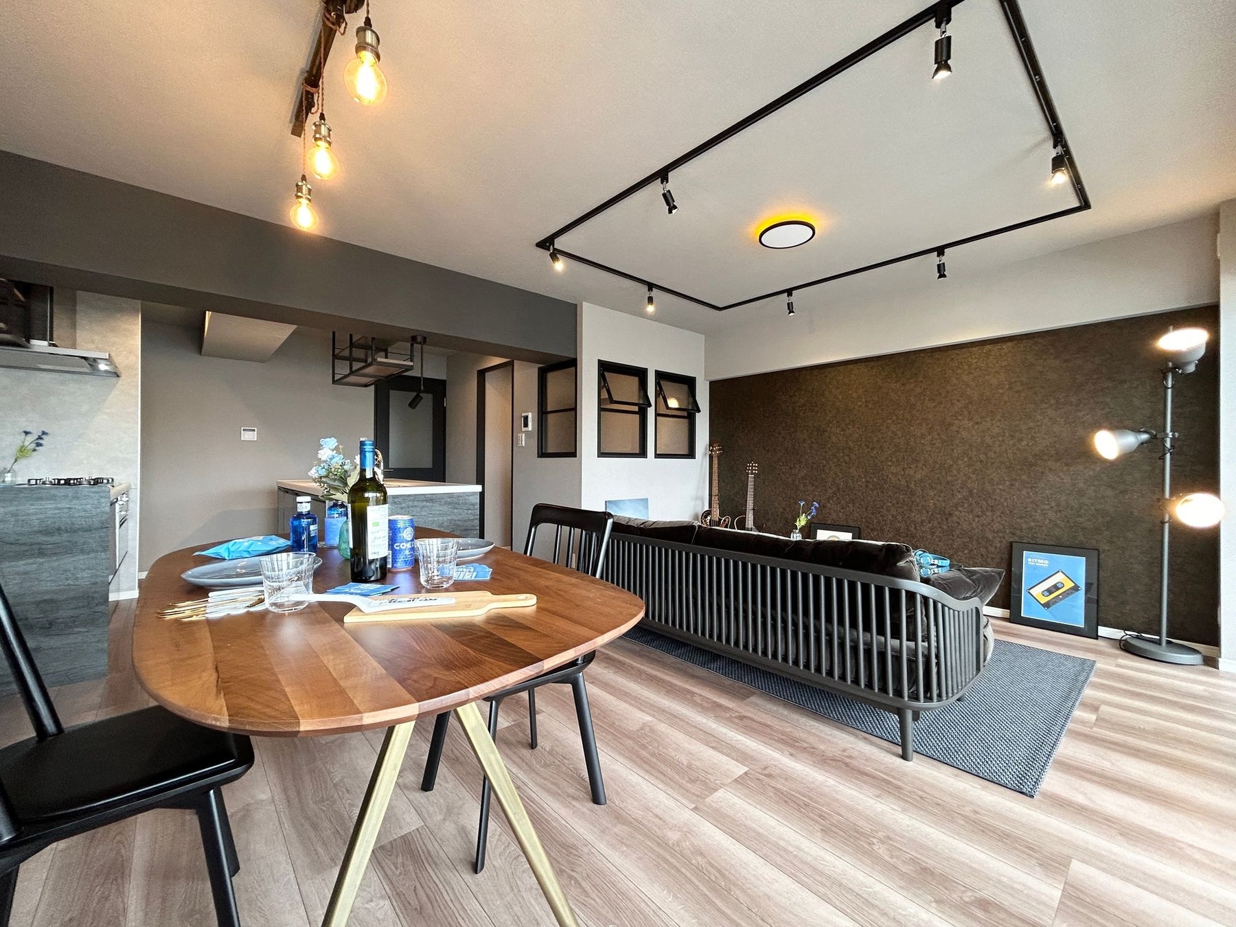 間取りはあえてリノベーションにより部屋数を減らし1LDKとしました。一人暮らしまたは共働きの若いカップルや夫婦を想定して、自由に空間をカスタマイズして使えるようにしました。趣味スペースとして最適なDENスペースが間取りのポイント。書斎としての利用やリモート勤務の仕事スペースとするのもおすすめ。自宅でも気分をリセットし、集中できる空間として活用できます。今回の物件には、入口にDOMA(土間)スペースをご用意しました。スケートボード、スノーボード、キャンプグッズなどアウトドアスポーツのギアを置くのにも便利です。外と内をつなぐスペースとして柔軟な利用を想定しています。部屋数を減らしたことにより広いリビングスペースが誕生。電子ドラム、ギター、音質にこだわったスピーカー、壁を利用して大きく投影するプロジェクターの設置など自由に自分時間を楽しんでいただけます(防音設備はなし)。「WONDERFUL TONIGHT」は大人の隠れ家をイメージ。クールな大人にふさわしく室内装飾の差し色はブルーで統一しています。