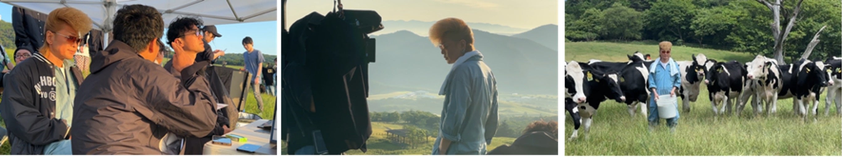 今回のCMでは酪農家役で出演した綾小路さん。“デジタルで酪農の見える化”をテーマに、朝日のぼる早朝、広大な牧場で、牛達と共に撮影に臨みました。奥田民生さんが本CMのために書き下ろした楽曲「ハナウタ」をノリノリで歌う場面も。朝早い中、爽やかなウインクや笑顔をみせてくれました。