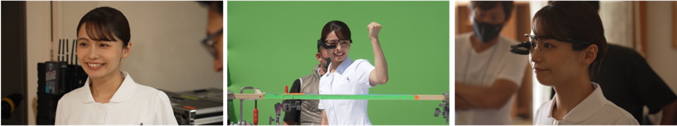 病院を舞台に、スマートグラスを着用し業務をこなすを看護師役を演じた足立さん。「安心を目指したいんです!」とガッツポーズをするシーンでは、納得いくまで何度もトライ。足立さんの明るい笑顔で、和やかな雰囲気の中で撮影を終えました。
