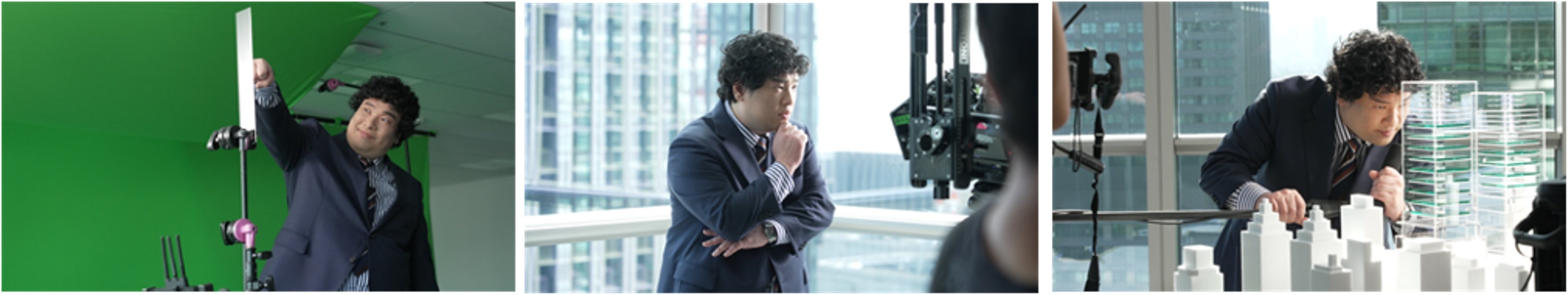 都市開発のデベロッパー役としてスーツ姿で登場した岡崎さん。グータッチや握手をするシーンでは、自ら何パターンもポージングと色々な表情を披露。細かい撮影位置の調整が続く中、的確に意図を掴み、撮影はスムーズに終了しました。