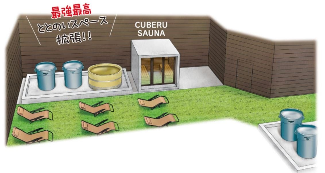 コンクリート製ならではの高いデザイン性と高い蓄熱性で新しいサウナ体験を提供するCUBERUサウナを富山県内初導入。さらに、サウナ設置に伴いととのいスペースも大幅拡張!サウナ横に水風呂も設置いたしますので最短導線で最高の「ととのい」を実現できます!