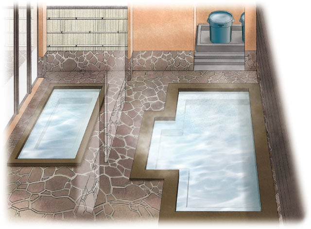 源泉風呂はおとこ湯、おんな湯ともにプライベート感を高め、浴槽サイズも大幅に拡大。類まれな泉質・成分量を誇るプレミアムな源泉を新しくなった浴槽でお楽しみいただけます。