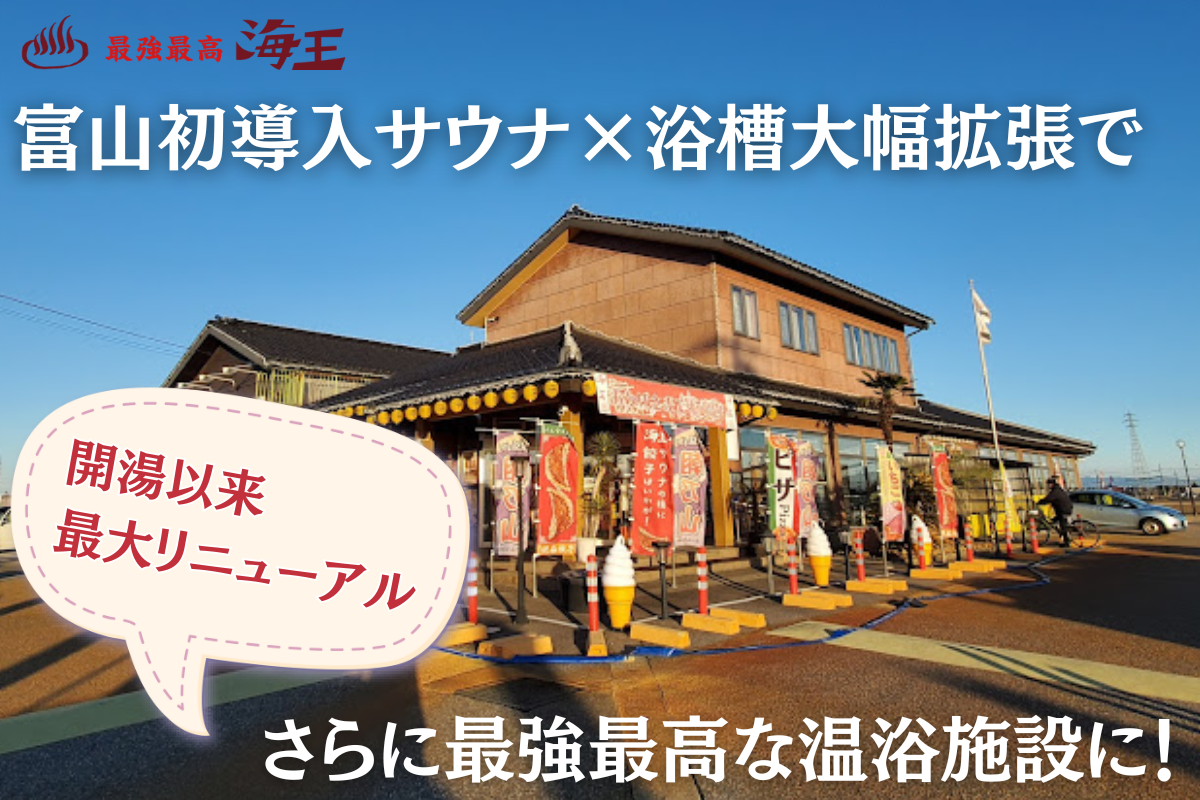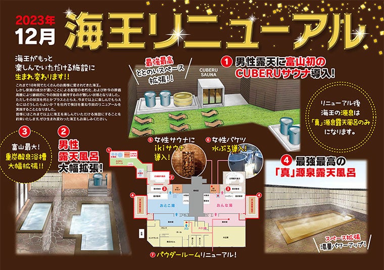 【富山】泉質ランキング北陸エリア10年連続1位の天然温泉海王が富山初CUBERUサウナ導入×浴槽大幅拡張リニューアルを実施!12月18日(月)リニューアルオープン!
