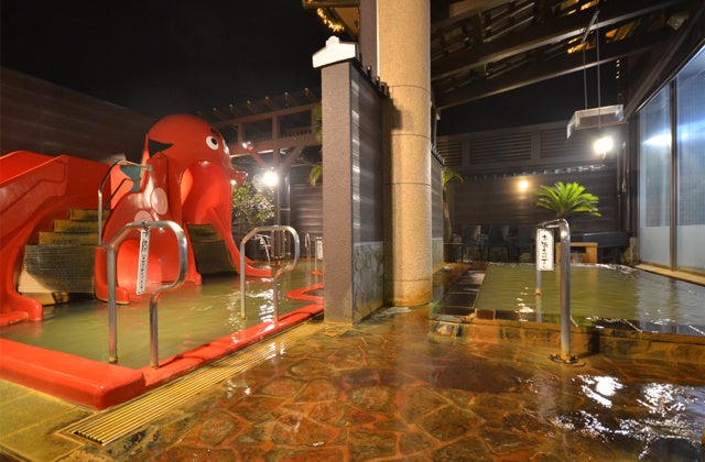 おとこ湯、おんな湯ともに「室内浴槽」と「従来の露天風呂」が全て「重炭酸泉」になります。重炭酸泉は県下唯一、炭酸泉の規模も県内最大となります。(おんな湯のたこ風呂は白湯となります。)