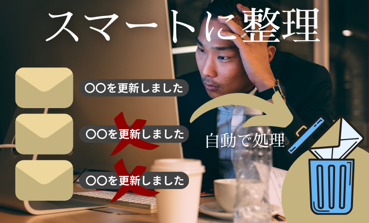 例えば、同じ配信元からの似たような通知メッセージの連続配信が挙げられます。「〇〇を更新しました」「〇〇での未読メッセージがあります」などです。知らないうちにこのような通知系メッセージは受信トレイを埋め尽くします。かといって、自動でゴミ箱に送ってしまうほど無視できるものでもありません。