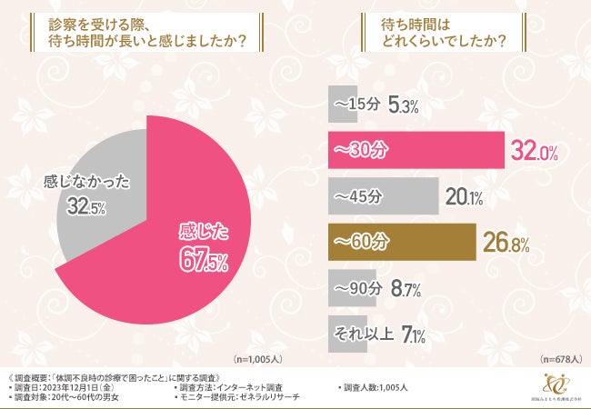 「診察を受ける際、待ち時間が長いと感じましたか?」と質問したところ、約7割の方が『感じた(67.5%)』と続きました。