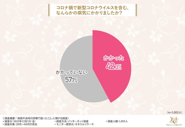はじめに、「コロナ禍で新型コロナウイルスを含む、なんらかの病気にかかりましたか?」と質問したところ、約4割の方が『かかった(42.3%)』と回答しました。