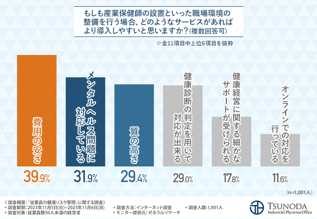 「もしも産業保健師の設置といった職場環境の整備を行う場合、どのようなサービスがあればより導入しやすいと思いますか?(複数回答可)」と質問したところ、『費用の安さ(39.9%)』と回答した方が最も多く、次いで『メンタルヘルス問題に対応している(31.9%)』『質の高さ(29.4%)』と続きました。