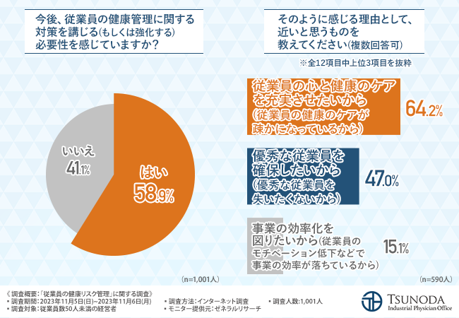 「今後、従業員の健康管理に関する対策を講じる(もしくは強化する)必要性を感じていますか?」と質問したところ、およそ6割の方が『はい(58.9%)』と回答しました。