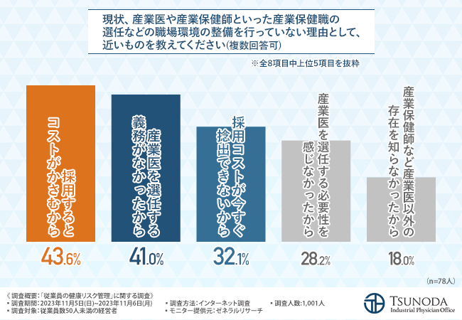 コストがかさむことを理由に、産業医や産業保健師などの採用を後回しにしている方が多いようです。