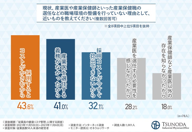 「現状、産業医や産業保健師といった産業保健職の選任などの職場環境の整備を行っていない理由として、近いものを教えてください(複数回答可)」と質問したところ、『採用するとコストがかさむから(43.6%)』と回答した方が最も多く、次いで『産業医を選任する義務がなかったから(41.0%)』『採用コストが今すぐ捻出できないから(32.1%)』と続きました。