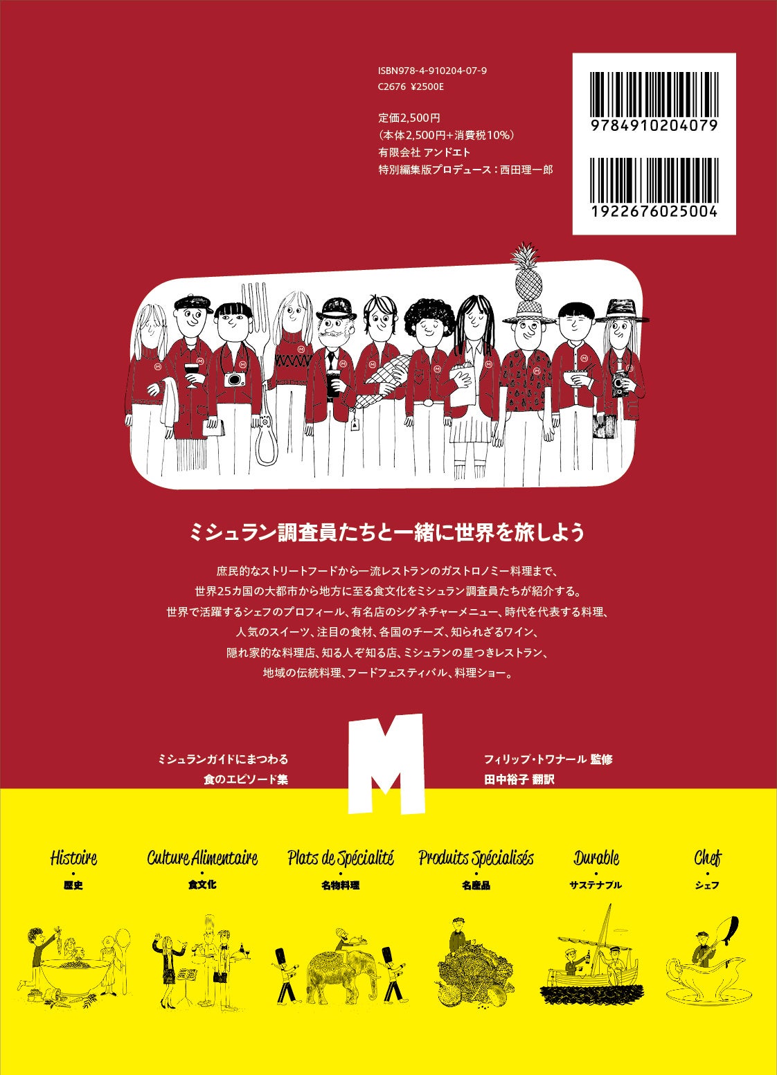 彼らの旅の手帳には、数多くのエピソード、出会い、思い出が綴られている。その旅の記録をみなさんにお見せしよう。ミシュラン調査員の案内で、世界の料理を楽しみながら、さまざまな驚き、感動、ホスピタリティ、愛情を味わってほしい。本書は、美食のプロである調査員たちのことばをまとめたエピソード集であり、その旅の軌跡を記した手帳であり、彼らの持つ膨大な食の知識をまとめた決定版である。さあ、ミシュラン調査員達と一緒に世界を旅しよう!