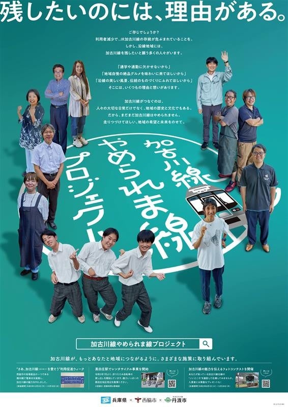 兵庫県と沿線の西脇市・丹波市は、県内のJRローカル線 加古川線の利用促進を図るために、沿線の魅力を再発信する「加古川線やめられま線プロジェクト」をスタートします。本プロジェクトは、加古川線をいつも利用する人、近くで暮らす人、沿線で仕事をする人といった「沿線に関わるひと」と「その声」をテーマに、「欠かせま線」「味わえま線」「出会えま線」という3つのカテゴリーで沿線の魅力の再発信と利用促進を図るプロジェクトです。