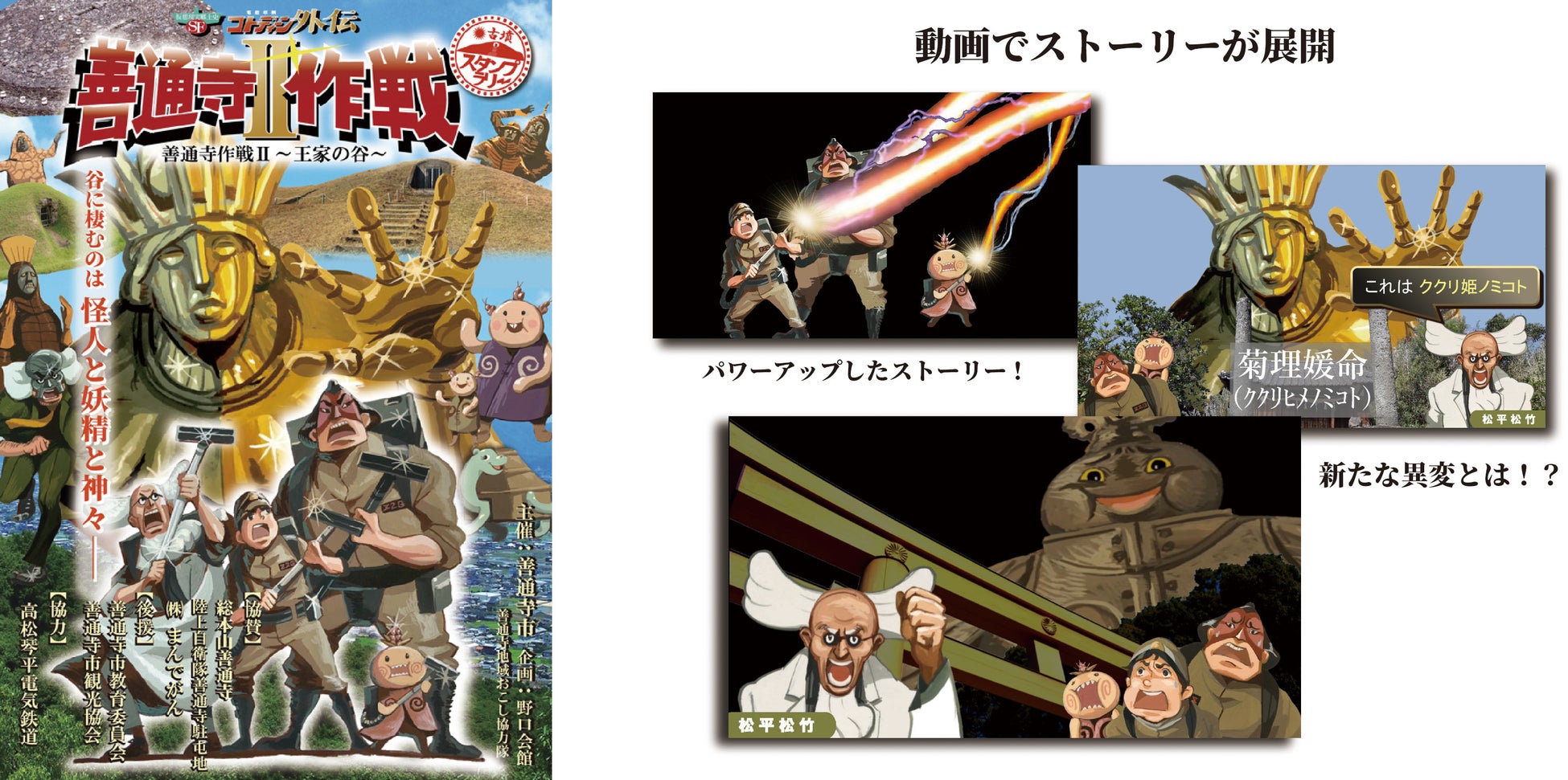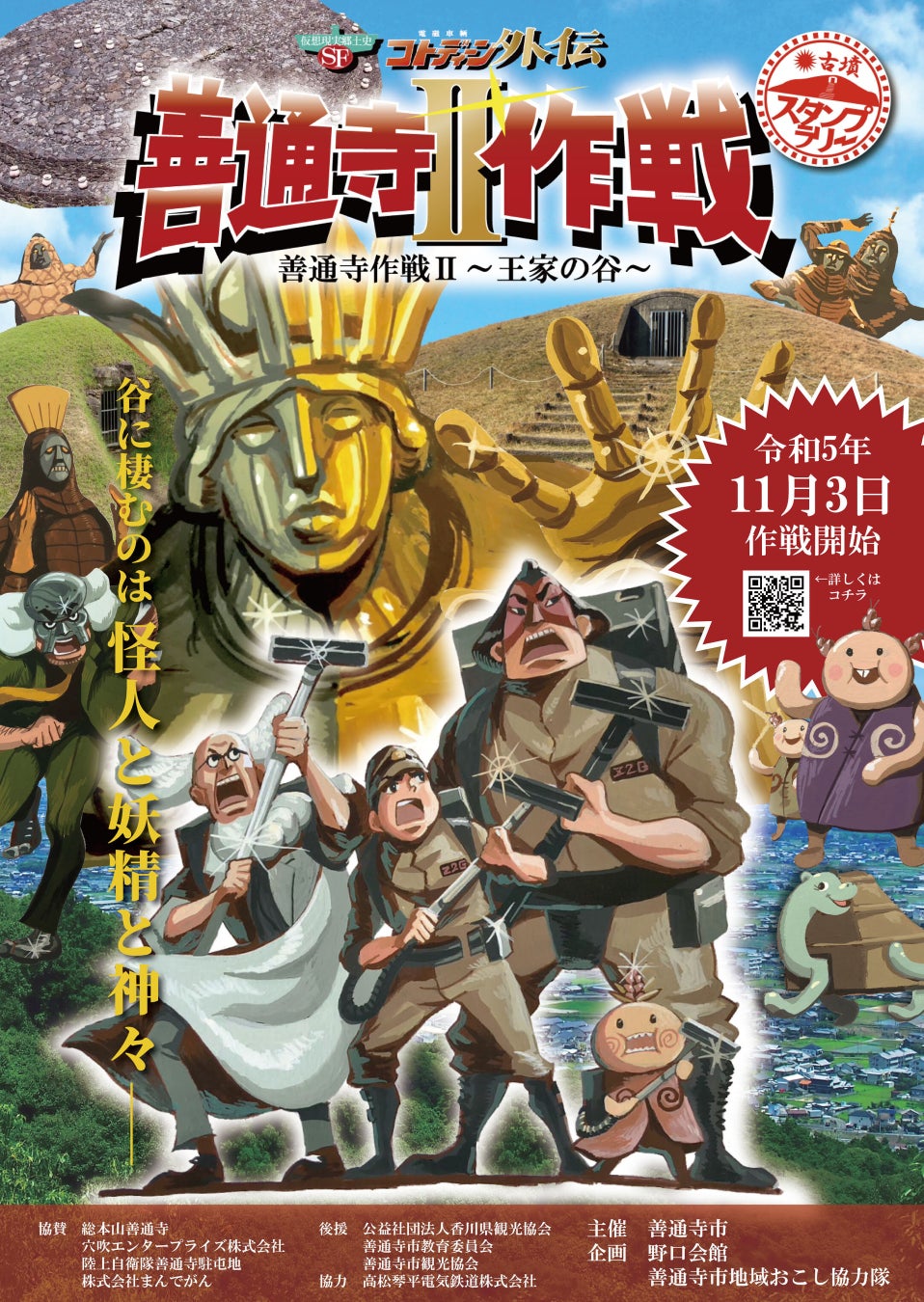 弘法大師空海の御生誕地であり日本有数のパワースポットとしても知られる、四国霊場第75番札所 「総本山善通寺」を擁する善通寺市。『善通寺作戦Ⅱ』とは、この善通寺市において、全く新しい角度から街の魅力を伝えていくことを目的とした、11/3(祝)〜3/31(日)まで開催するスタンプラリー企画です。市内に点在している「古墳」をはじめとする遺跡にフォーカスを当て、オリジナリティ溢れる世界観とともに、スタンプラリーを楽しみながら街中を巡っていただけます。