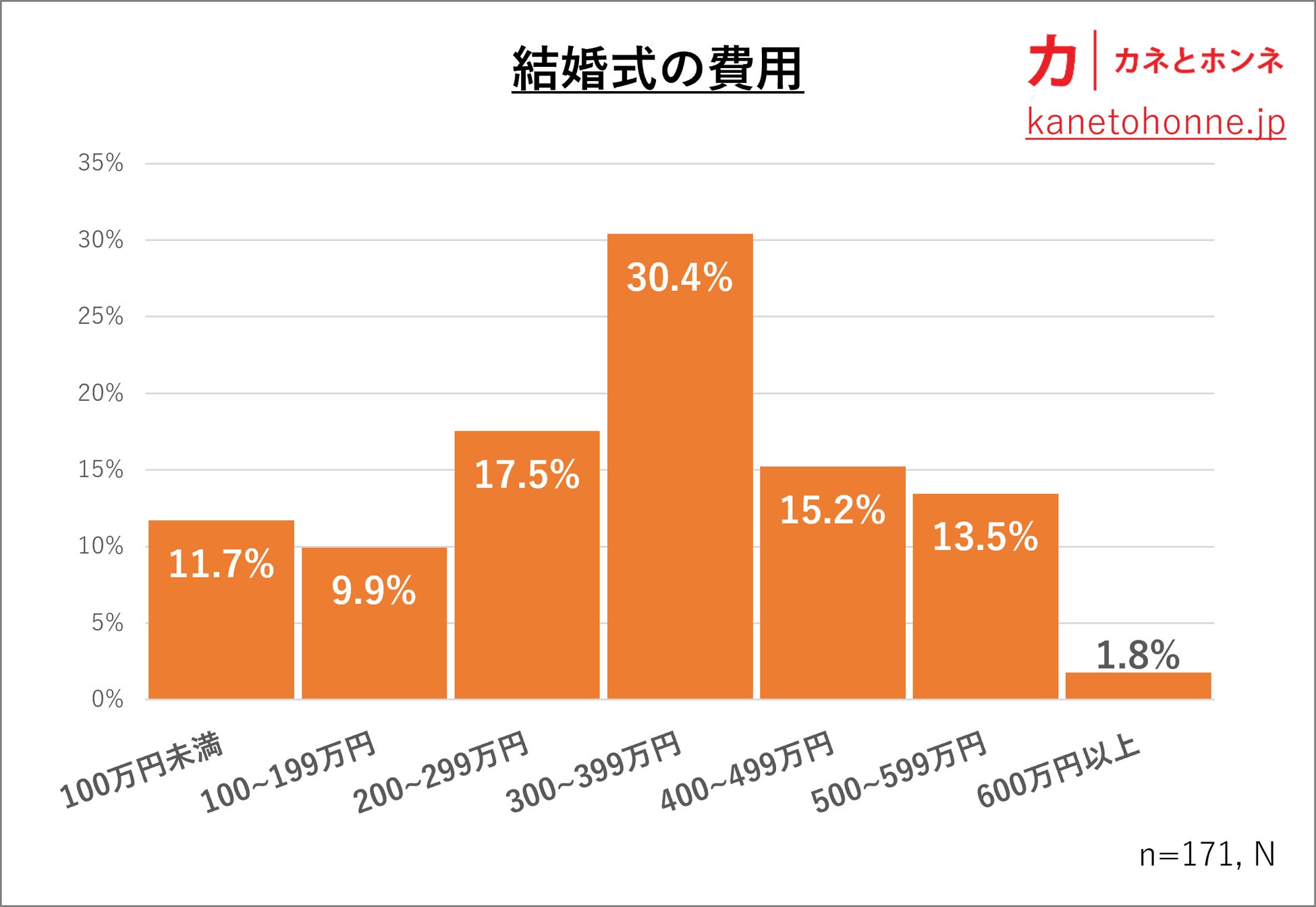 結婚式にかかる費用の平均は300.2万円。費用の分布をみてみると、300万円台が30.4%と多数を占めています。親族やごく親しい間柄の知人のみを招待したと思われる100万円未満の挙式は11.7%。もちろん、この他に結婚指輪や新婚旅行、新居への引っ越しなども必要になるものと思われます。一生に一度の晴れ舞台とはいえ、やはり300万円の壁は挙式を躊躇するのに十分な金額なのかもしれません。