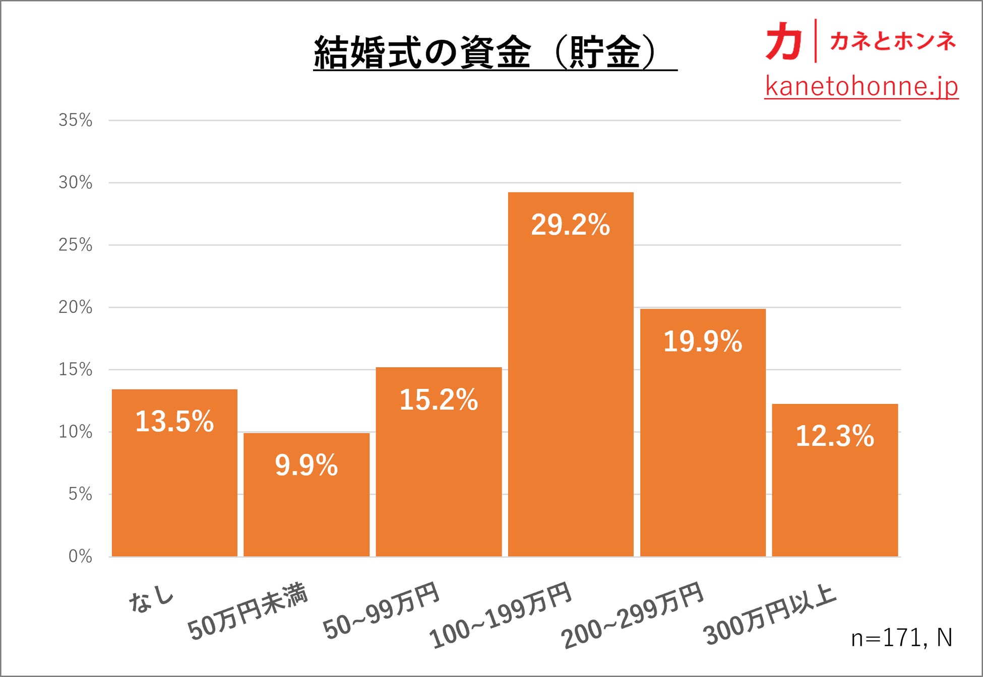 貯金から工面した結婚資金は平均133.8万円。傾向としては、100万円台が29.2%で約3割となっていました。300万円以上が12.3%である一方、「拠出なし!」と思い切りの良いカップルが13.5%いることも分かりました。