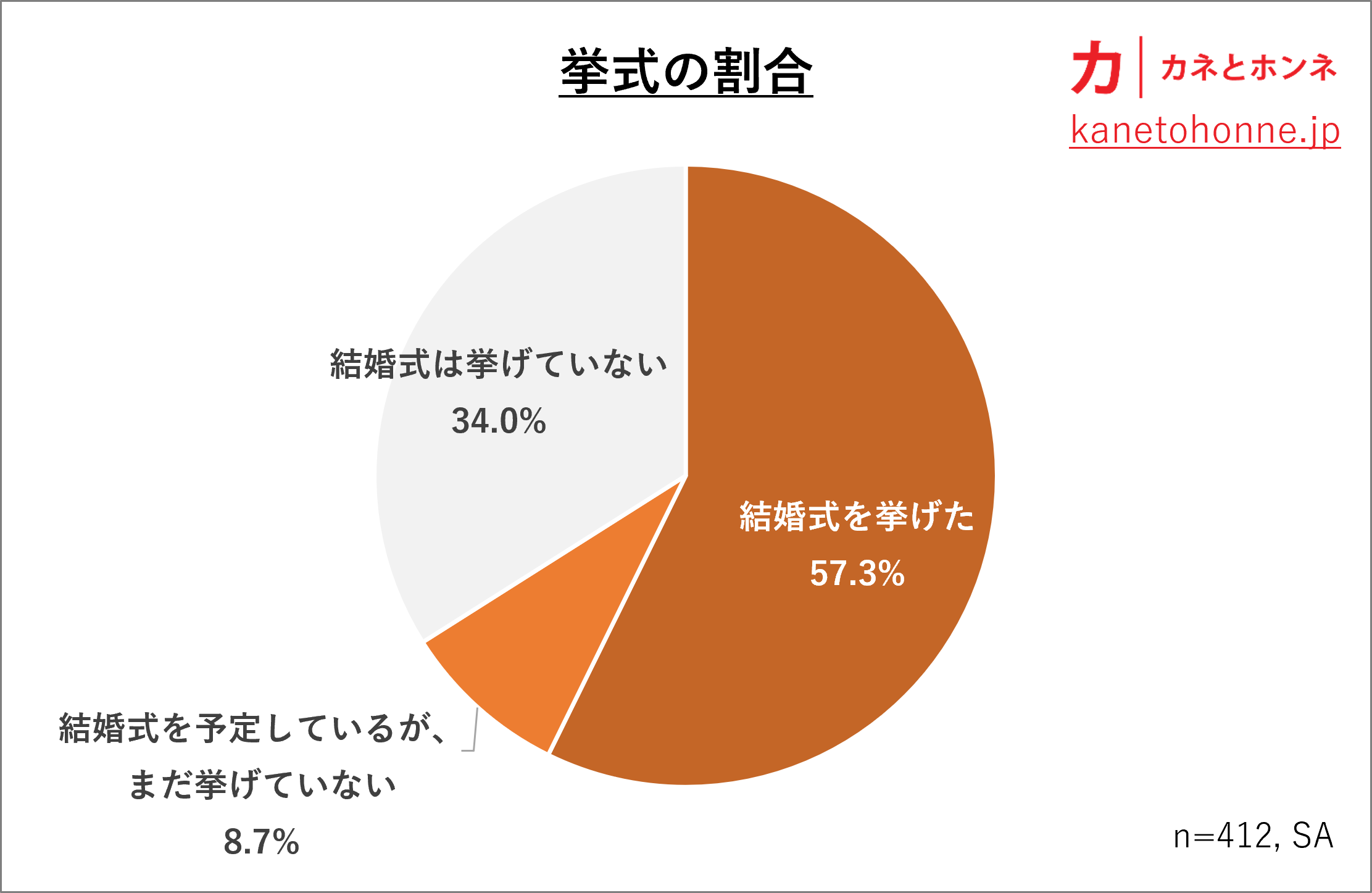 結婚式を挙げた(もしくは予定している)割合は66.0%でした。逆に、結婚式を挙げていない割合は34.0%で、3人に1人は挙式していないことが分かりました。結婚式にかかる、安くない費用が影響しているのかもしれません。