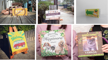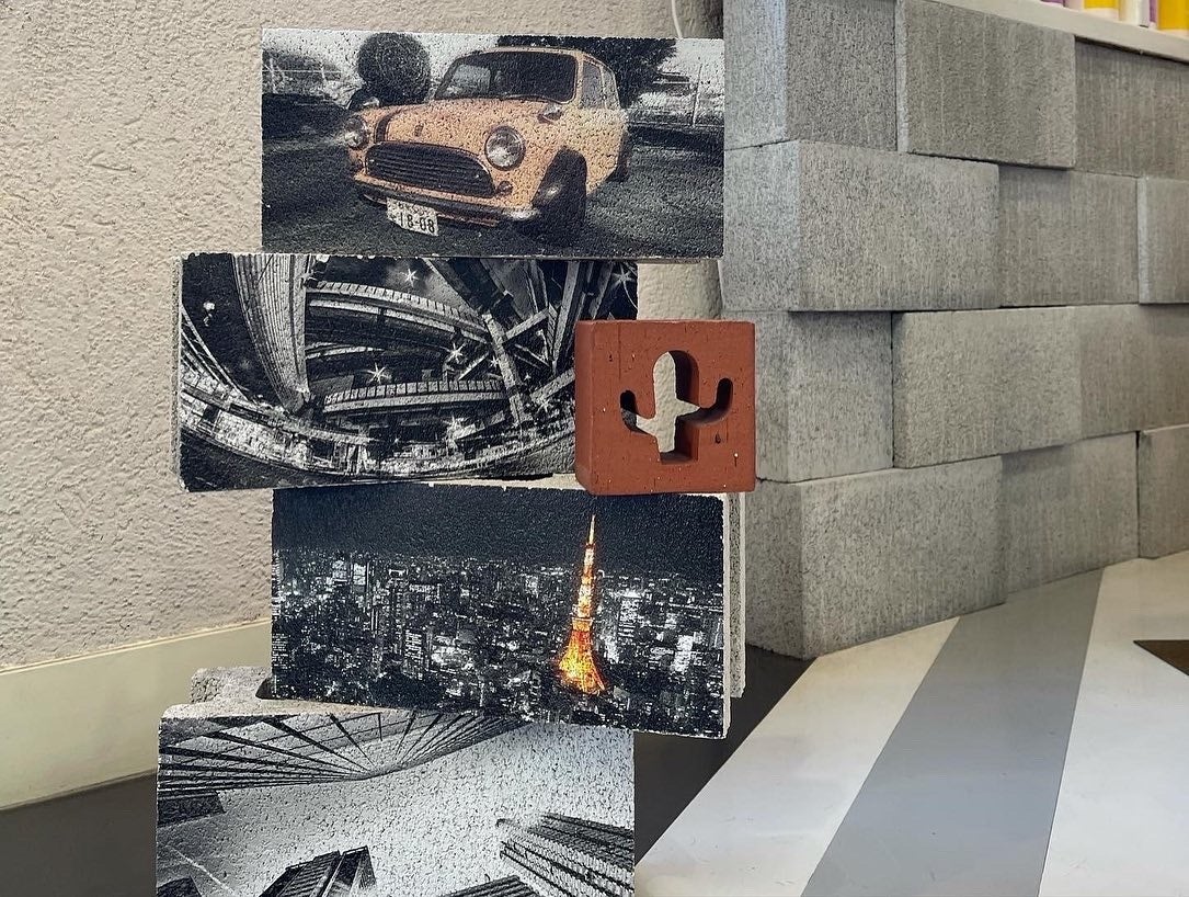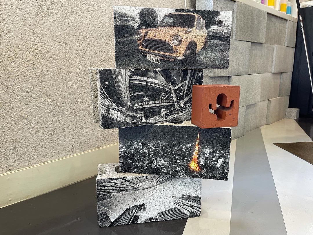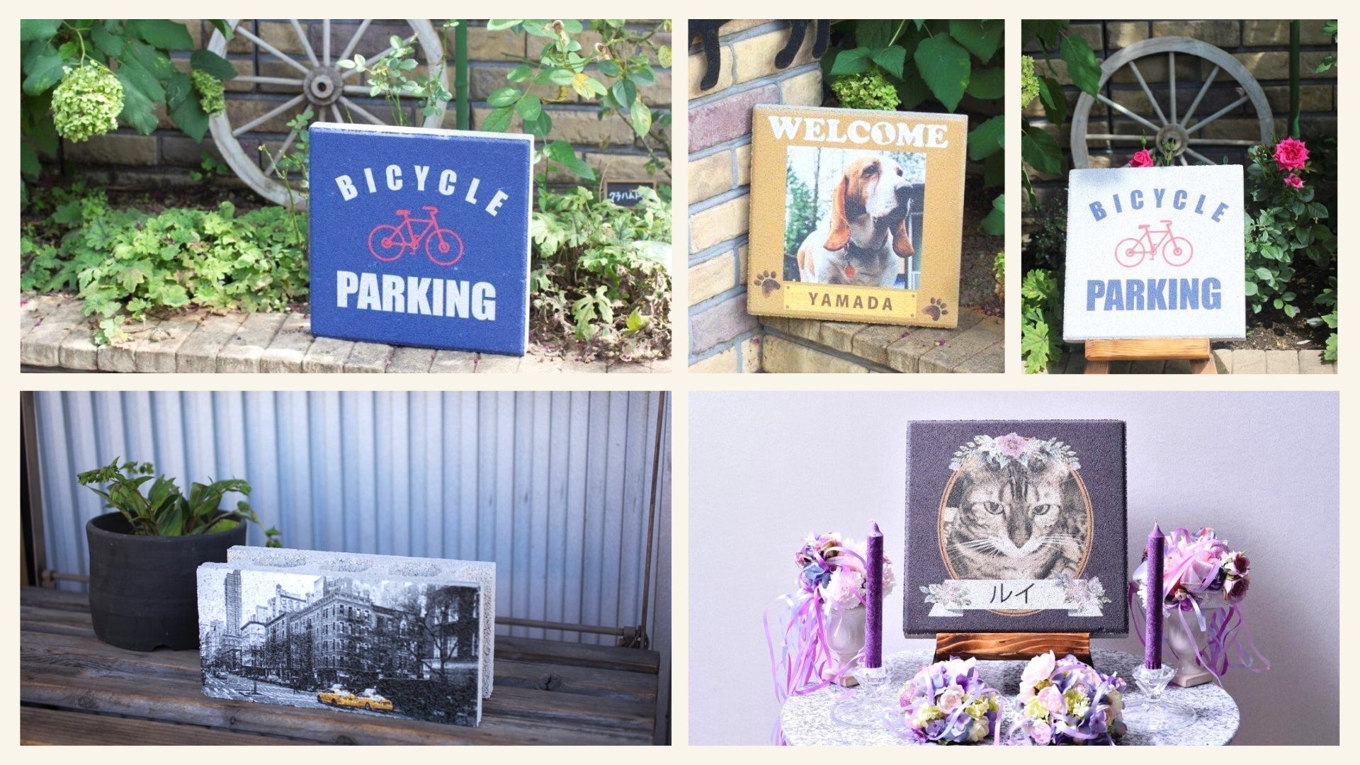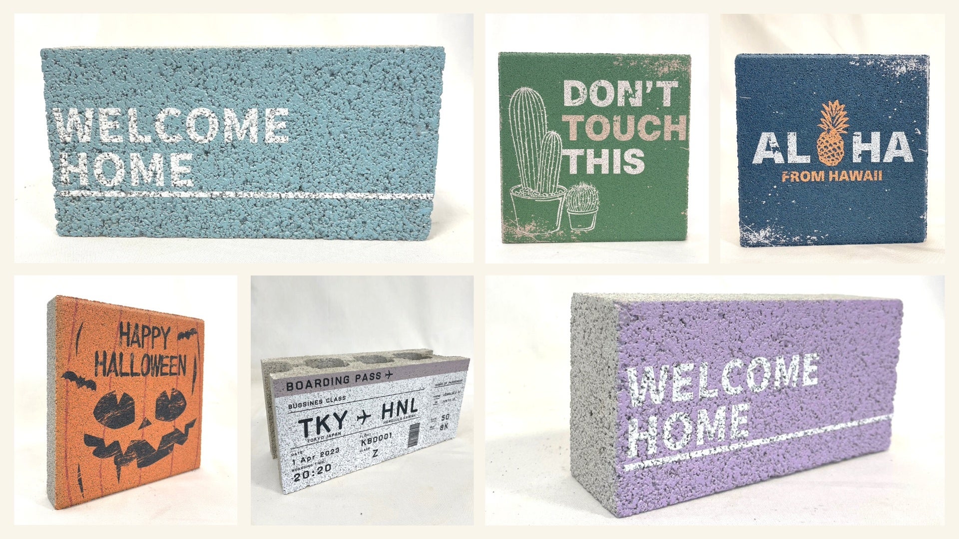 制作のきっかけは、車を運転していたときに目にした、看板が飛ばないように置かれた重石(おもし)として使われていたブロックです。それを見て、ブロックに直接印刷すれば、重石を置く必要はないのではないかと思い、ブロックに直接印刷することを社内で提案しました。当初は、ブロックに「道案内の矢印」、「駐車場マーク」、「ここにものを置かないでください」などのメッセージを書くことを考えていましたが、今は、メッセージ以外にも、イラストや写真を印刷することで、アート商品(ガーデン雑貨)としても利用されています。平板ブロックや小さいブロックをおしゃれなインテリアになり、販売しています。例えば、ペット写真でウエルカムボードを作れば、家族の気持ちがホッとする玄関を作ることができます。