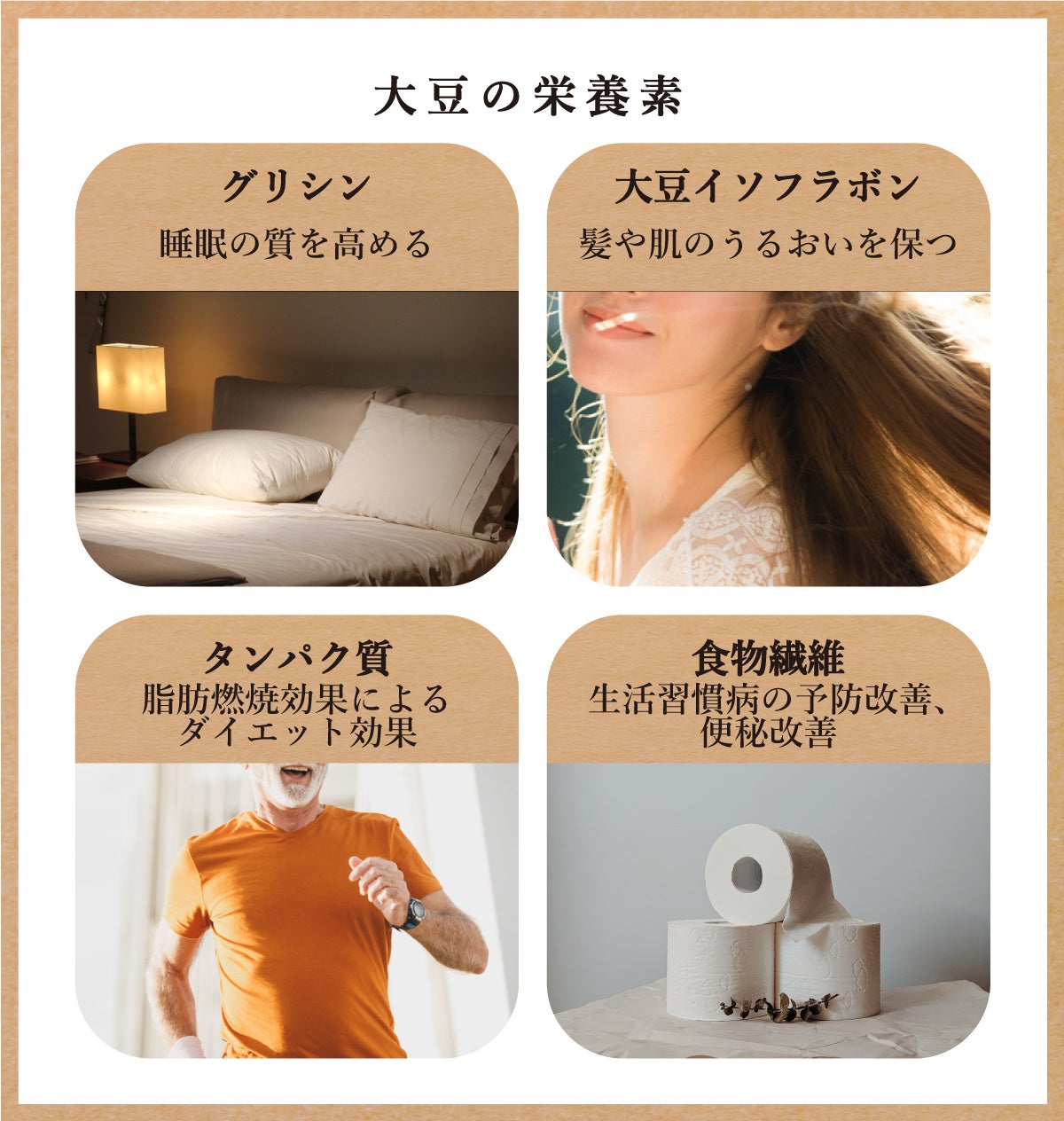 健康上の理由や、妊娠・授乳中の方など、できるだけカフェイン摂取を控えたいと感じている方におすすめです。また、大豆からできているため、お肌や髪を美しく保つ大豆イソフラボン、体をつくるタンパク質も含まれており、普段から健康を気遣っている方へもおすすめです。