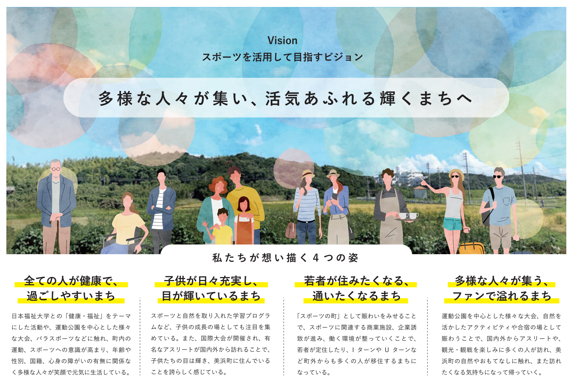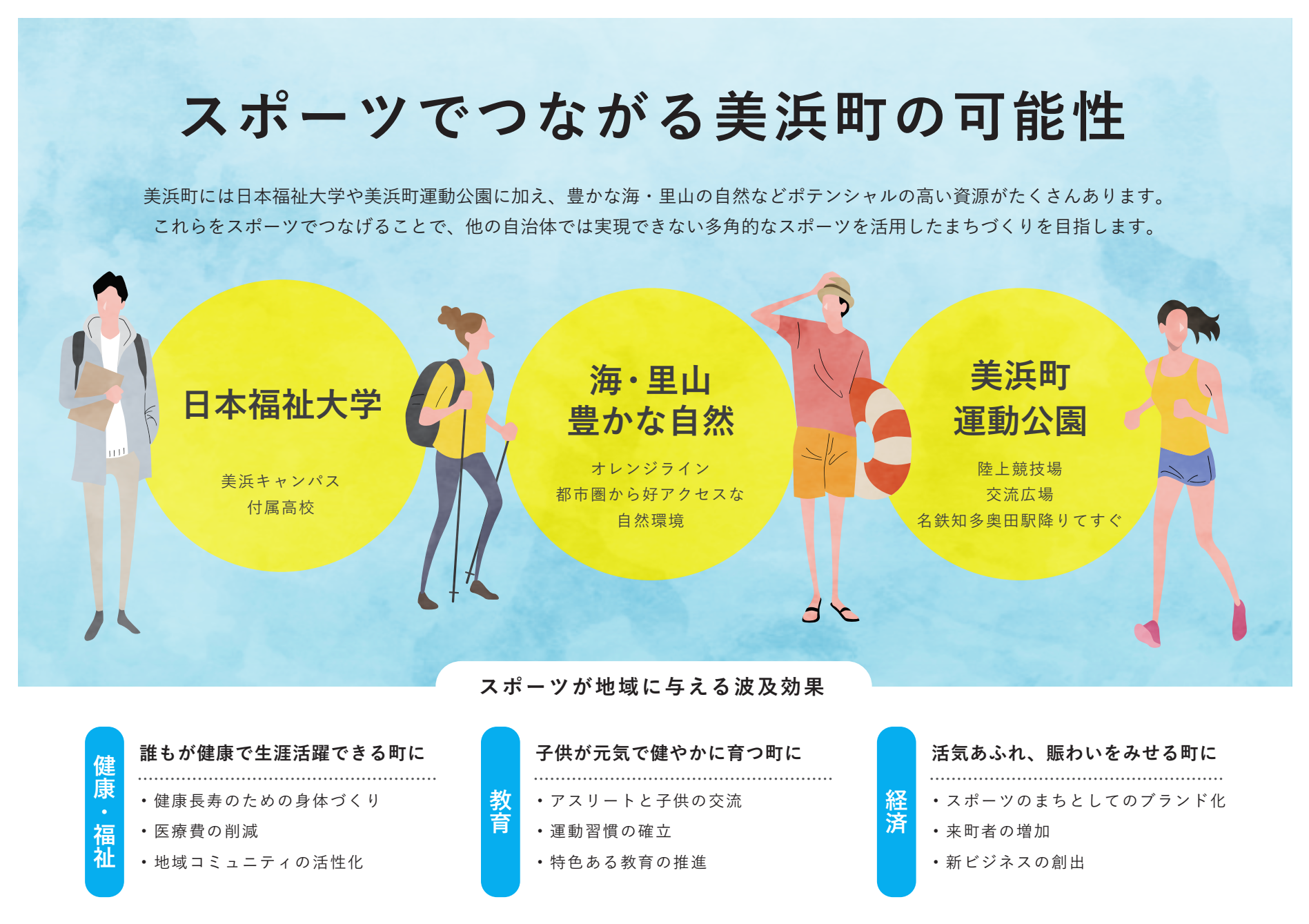 本町では、「スポーツでつなぐ、美浜の未来」をスローガンに、来年度一部オープンする美浜町運動公園を軸に、スポーツと健康・福祉・教育・経済を連動させた「スポーツを核としたまちづくり」に取り組むことで、本町が抱える課題の解決や交流人口の増加、本町の経済・社会の活性化を目指しています。