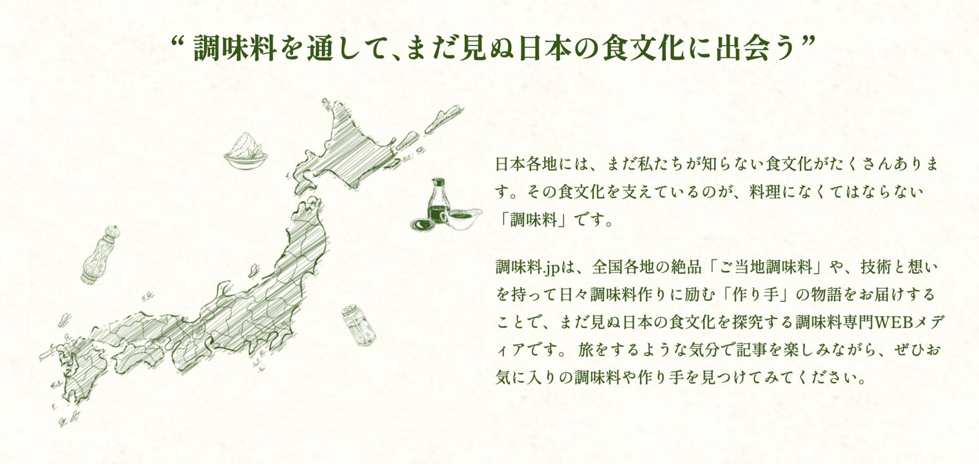 ふるさとの味を支えるご当地調味料に特化することで、私たちがまだ知らない食文化に出会える、これまでにないWEBメディアです。