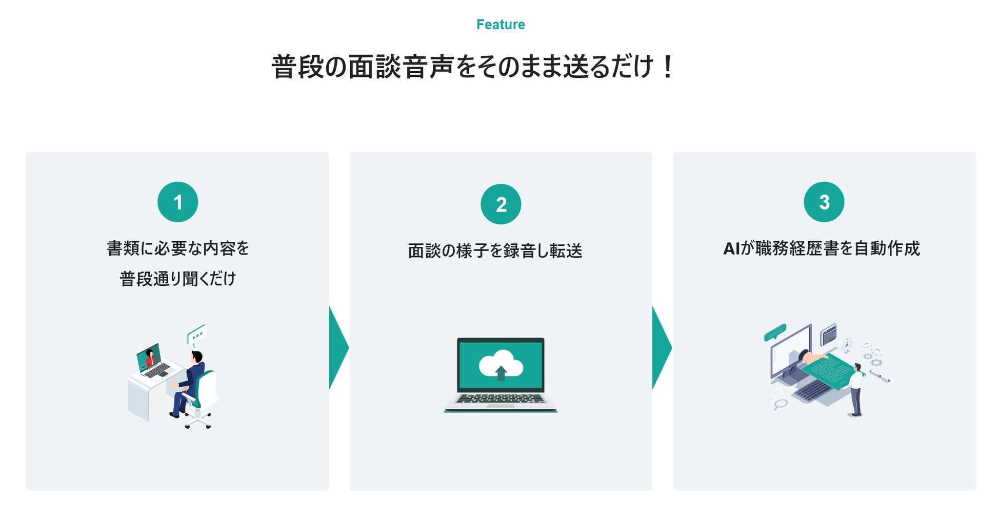 生成AIの技術により、面談を録音・録画しアップロードするだけで履歴書・職務経歴書が自動で完成。