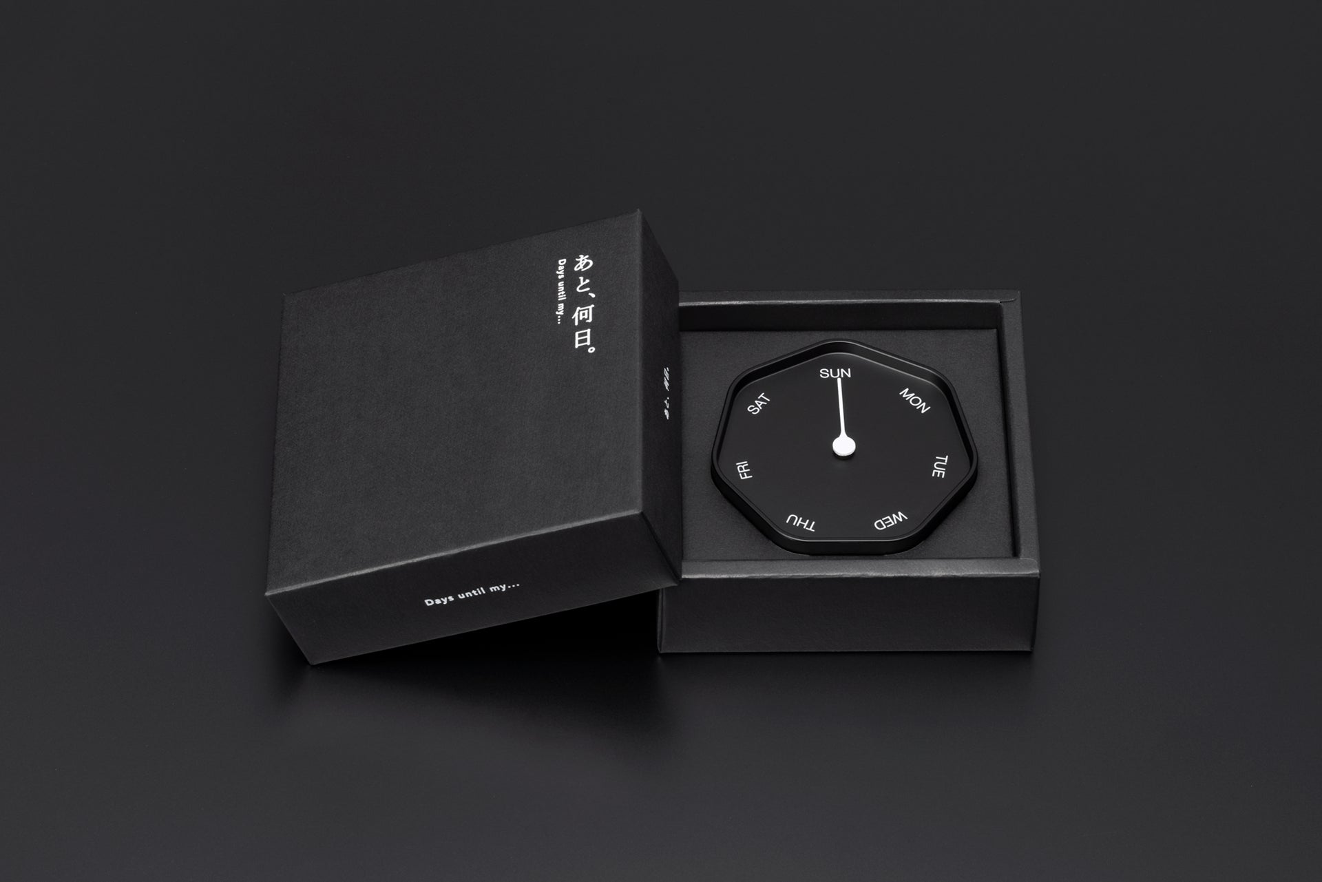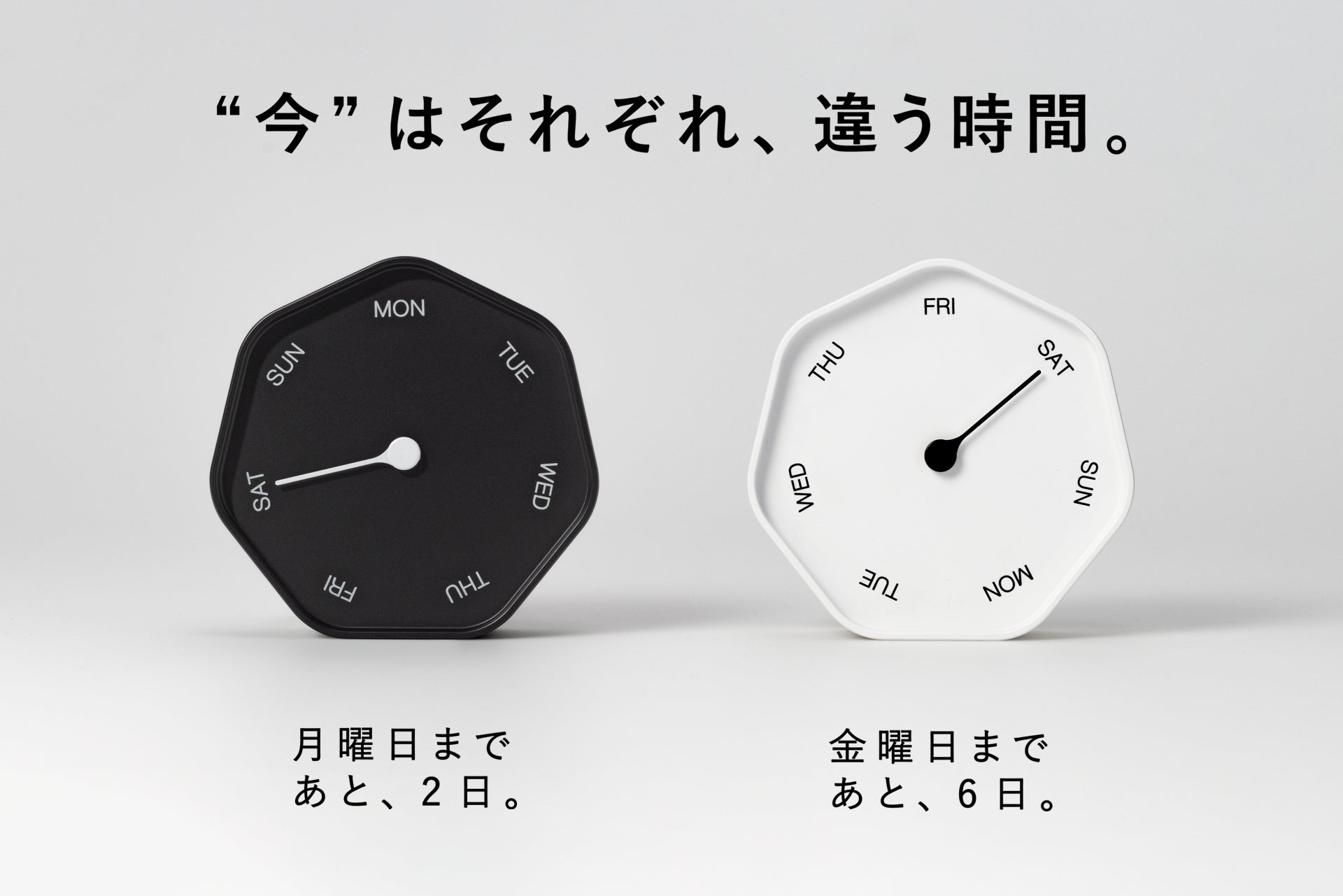 自分にとって大切な日を設定して、時計を回して12時の位置に指定の曜日をセットする。するとこの時計はその日まで「あと、何日。」を刻みます。この、楽しみや締切りまで「あと、何日。」という意識が、 毎日をワクワクさせたり、心の準備をさせたり、 締め切りまでの追い上げを鼓舞したり、 日常の意識と行動を変える小さなきっかけになります。