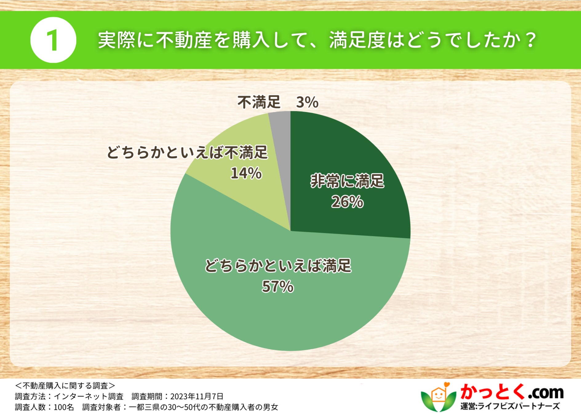 不動産購入経験者を対象にアンケート調査を行いましたが、実に8割以上の方は不動産購入に対して満足していることが明らかになりました。