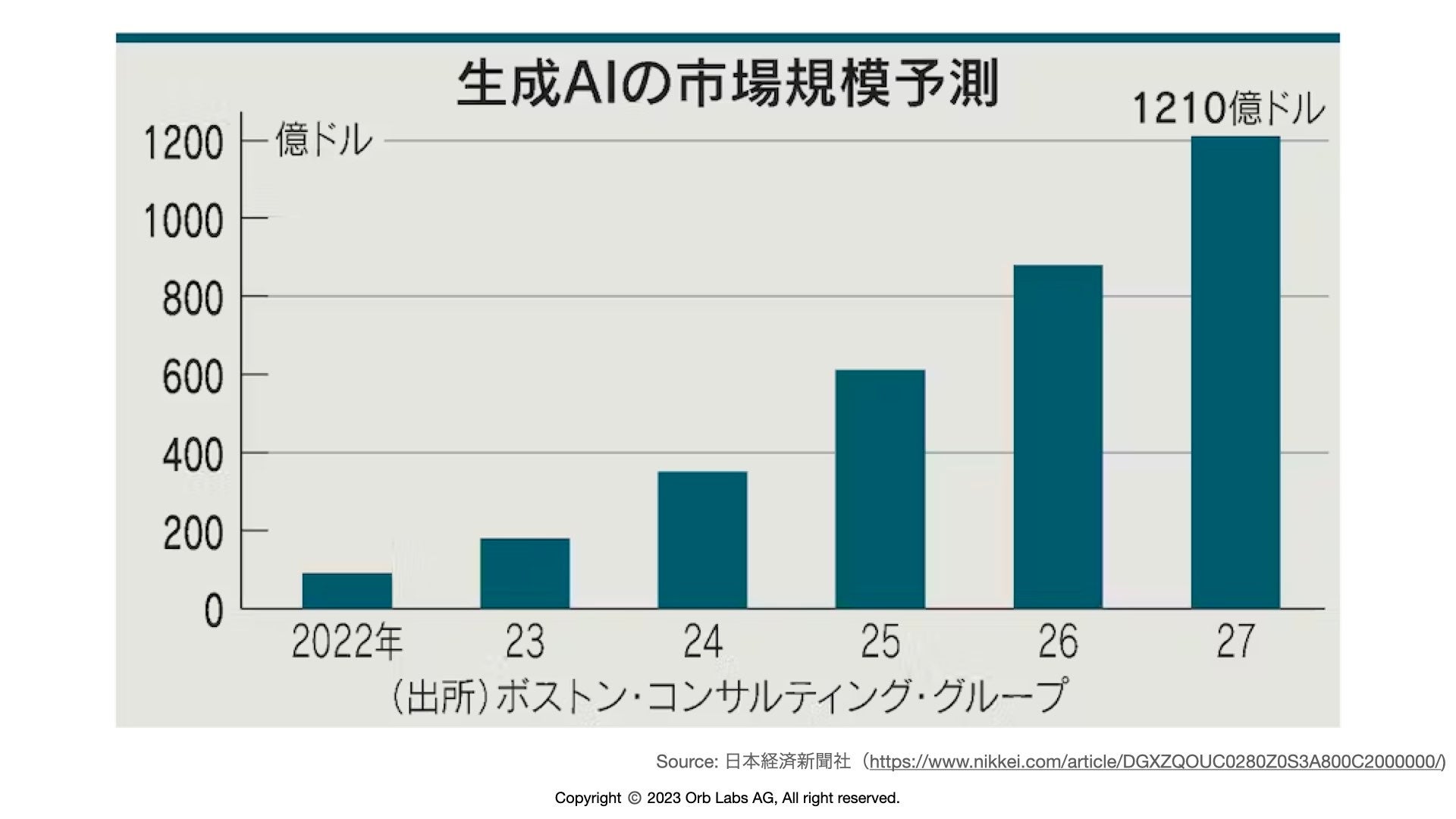 一方で、AI市場は、OpenAI社がChatGPTを2022年11月に公開したことをきっかけに新たな市場成長段階に入り、今、個人が簡単にプロレベルの文章・画像・動画を作ることができる「生成AI」の市場が特に急激な成長段階に入りつつあります。予測では、2022年時点で1兆円程度の市場規模が2027年に17兆円程度に成長すると予測されており、5年で17倍(単純計算で年平均3.4倍の成長力)になると言われています。