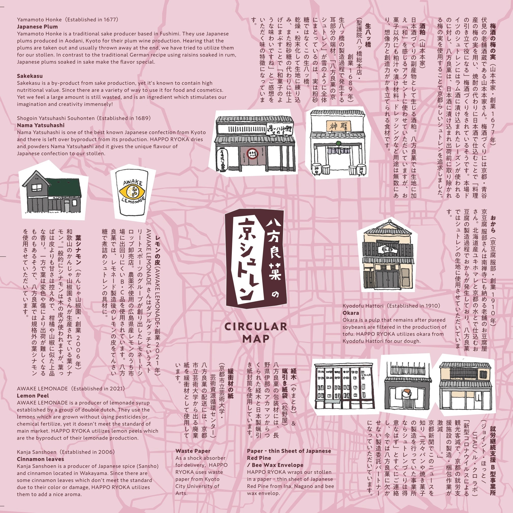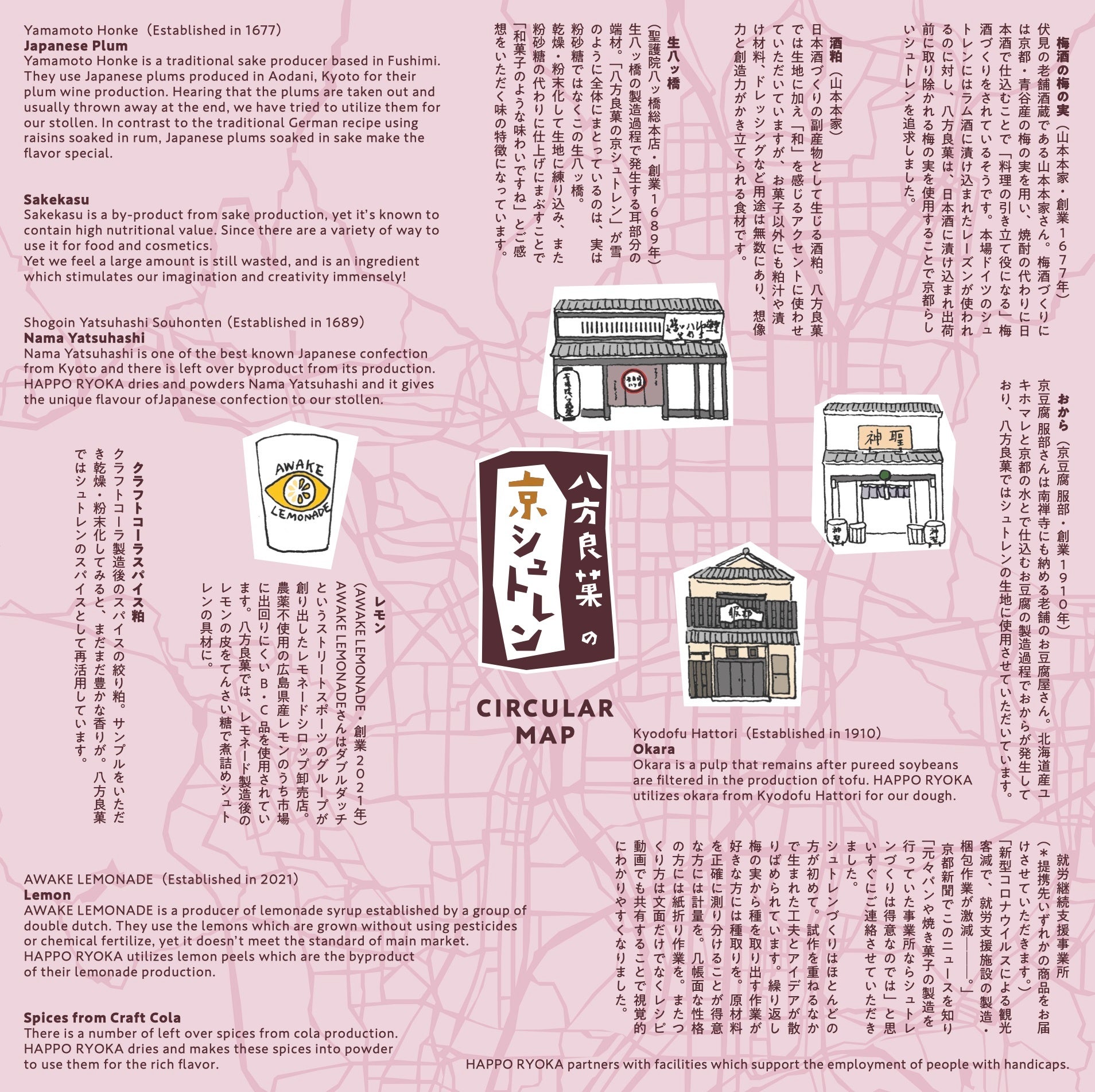 副産物・規格外由来食材のほか原材料には極力こだわりある国産材料を使用したPlant-Based品。ホールとハーフに同封されるリーフレットは日本語・英語表記で、ベジタリアン / ヴィーガンの客層やインバウンド向けのお土産としても人気が高まっています。レシピは京都の料理人が監修し、福祉作業所が製造を担当しています。