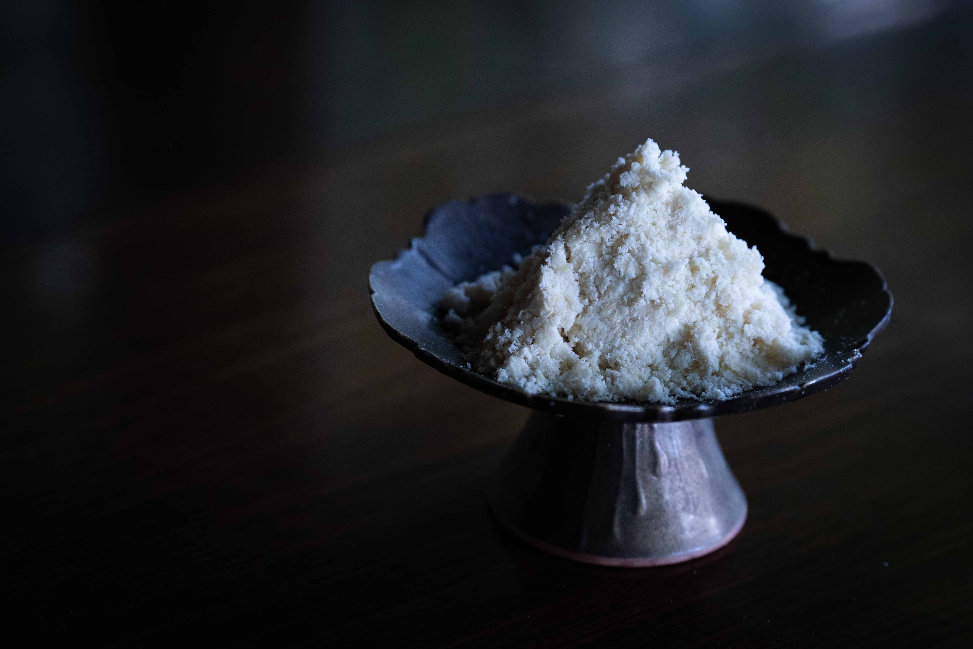 生八ッ橋の製造過程では、切り落とされた耳部分の端材が出てしまうそうです。サンプルをいただいてみるときし麺のような形状で、味はもちもちとしてニッキが香り高い生八ッ橋そのもの。 主原料は米粉と砂糖なので八方良菓では乾燥・粉末化し、生地に練り込んだり仕上げに粉砂糖の代わりにシュトレン全体に纏わせたりしています。「和菓子のような味わいがする」という感想をいただく由縁のアクセントになっています。