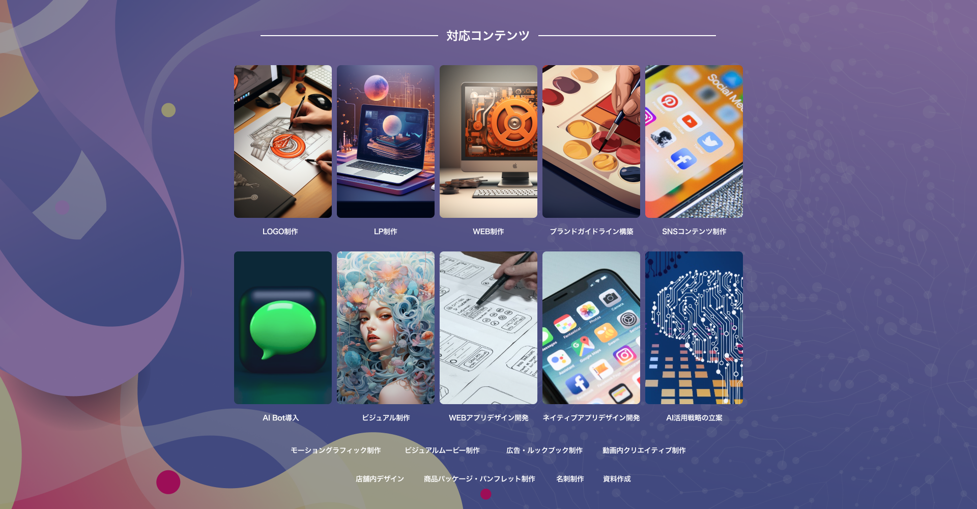 その他、モーショングラフィック制作、ビジュアルムービー制作、広告制作、動画内クリエイティブ制作、店舗内デザイン制作、商品パッケージ・パンフレット制作、名刺制作、資料作成、までをご要望に合わせてサポート。