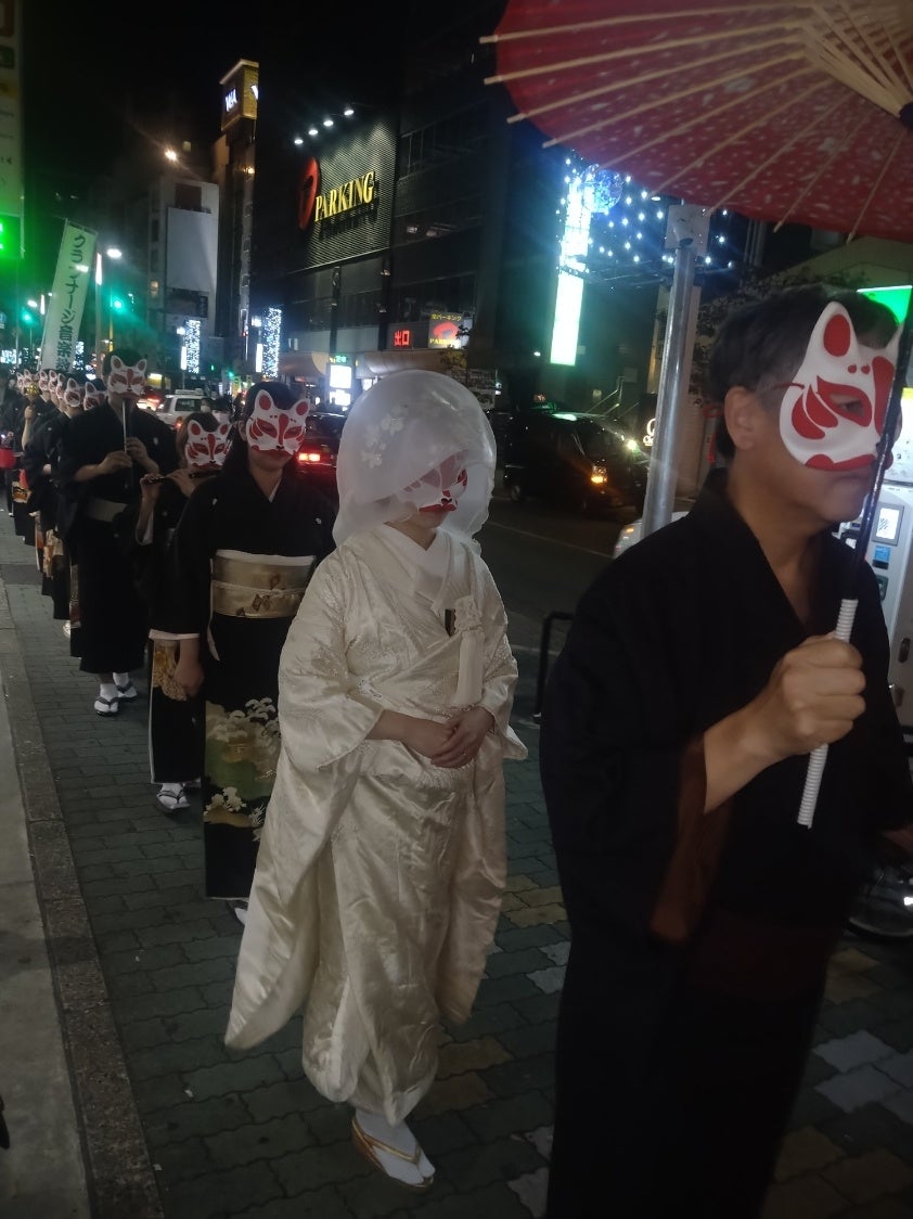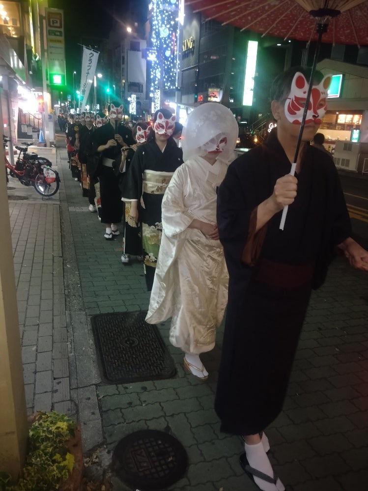 当日は17時30分頃から「狐の嫁入り行列」を開始いたしました。和装に身を包み、狐の面を被った13名の社員・講師が栄の街を練り歩きました。音楽教室の運営会社らしく、和楽器の演奏も併せて披露。天候にも恵まれ、約1時間のイベントを無事終えることができました。