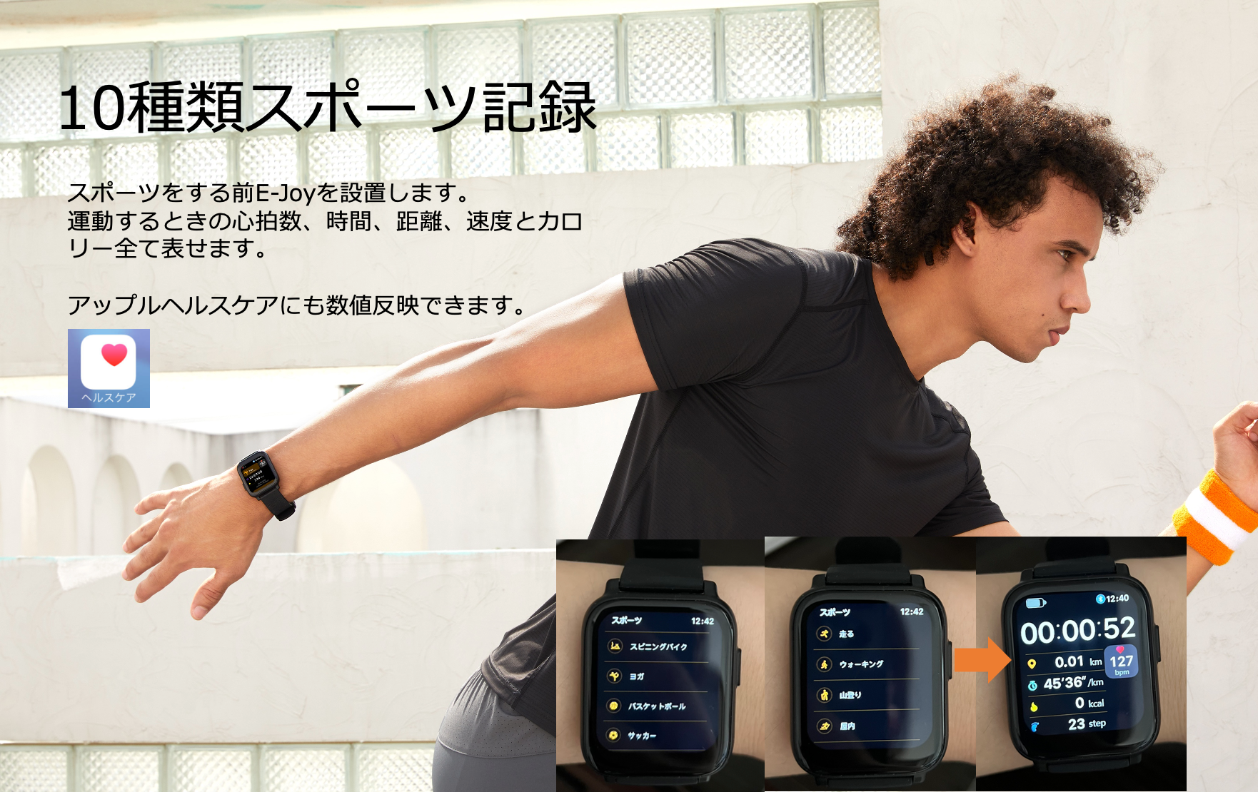 E-Joyの機能ボタンにある「スポーツ」をタッチすると、10種類のスポーツが表します。スポーツの種類を一つ選んで、GPS機能が起動します。運動するときの距離、歩数、心拍数、カロリーを記録します。エアロバイク、ヨガ、バスケ、サッカー、バドミントン、走る、ウォーキング、山登り、屋内運動、サイクリング日常生活にあるスポーツや運動が全て測ります!
