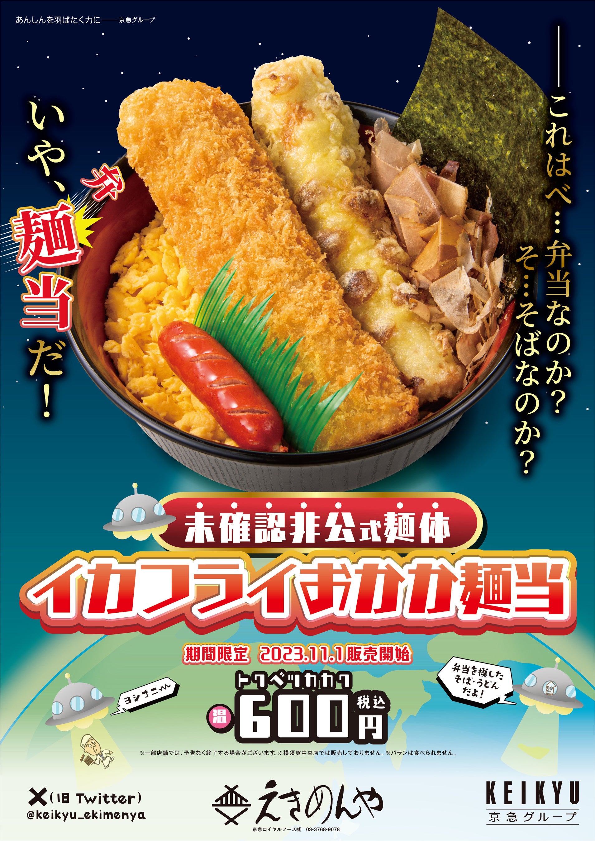 京急ロイヤルフーズ株式会社(本社:東京都大田区)が運営している駅そば「えきめんや」で、巷の人気弁当<イカフライおかか弁当>を模した具材を、そばのトッピングに使用した新商品を販売します。見た目は弁当そのもの!初めて見る印象と思考を惑わす一品は、まさに「未確認飛行物体」ならぬ「未確認非公式麺体」。ボリューム満点の満腹商品を特別価格でご提供!~あなたも未知なる体験をしてみては!~
