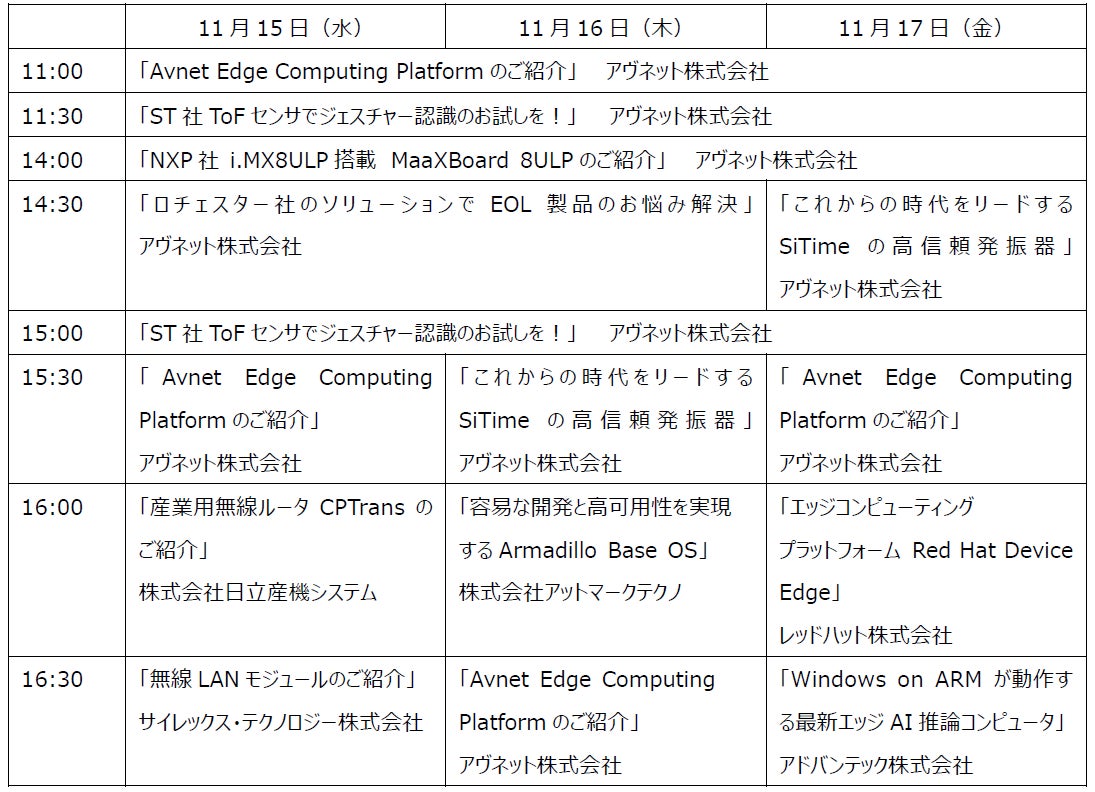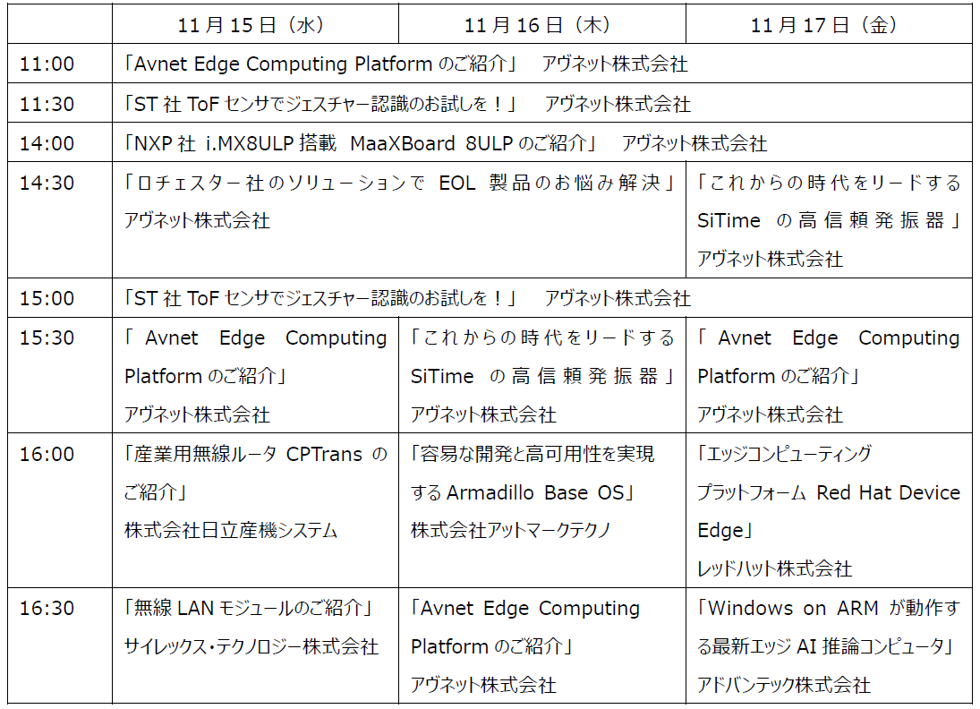 当日は、「Edgeデバイスのスマートな開発設計をサポート」をテーマにAMD、NXP、オンセミ、ローム、STなどの主要サプライヤーの製品ポートフォリオや事例を含む様々なソリューションを展示します。ブースでは、「Avnet Edge Computing Platform」、「ワイヤレス&スマートホーム」、「センサ&アクチュエータ」、「ACRiルーム」、「IoTプラットフォーム」、「コネクティビティ」、そして「ミニ ライブ プレゼンテーション」の計7つのコーナーを展開します。「ミニ ライブ プレゼンテーション」では、当社やパートナー企業のスペシャリストがエッジテクノロジーの技術開発の課題や最先端のソリューションについてご説明します。プレゼンテーションは1コマ15分で、その後、一部のセッションでは製品のデモンストレーションを行います。