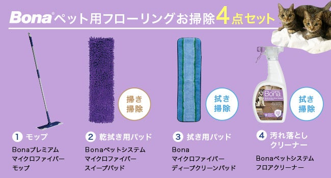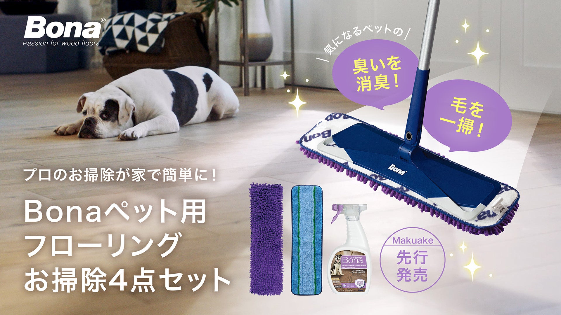 ペットを飼われているご家庭のそんなニーズにお応えするのが、今回発売する<Bona ペット用フローリングお掃除4点セット>です。